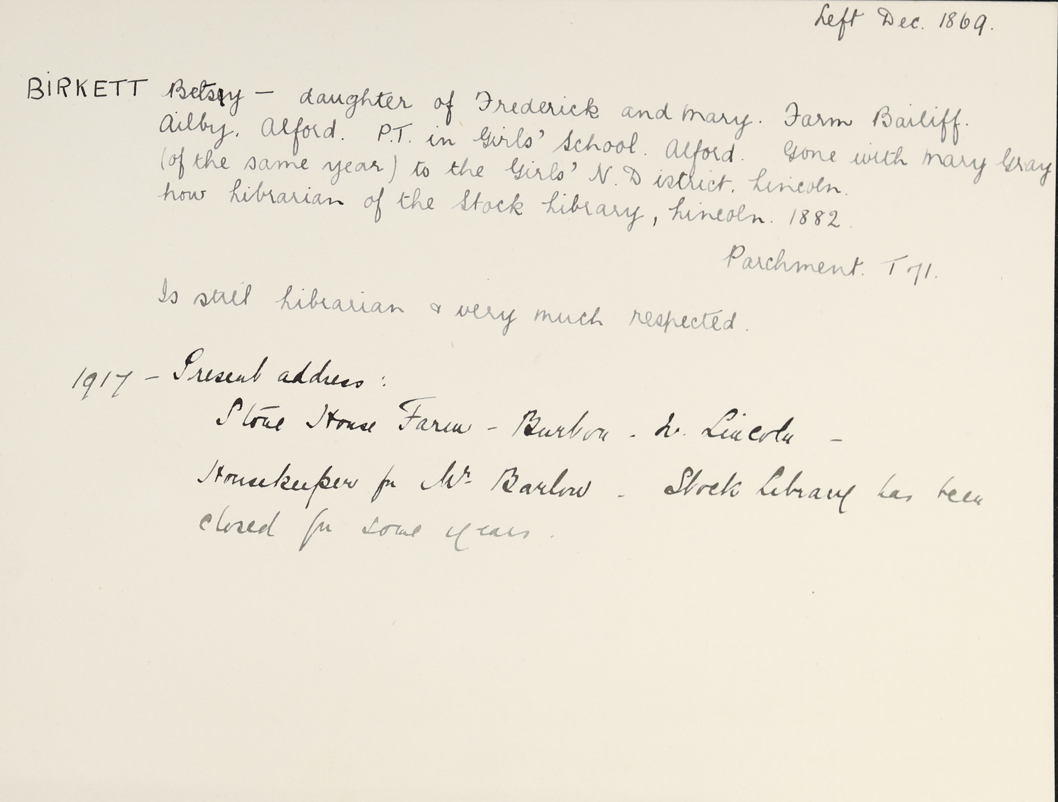 She is at 2 Rasen Lane, Lincoln. She is head of the household (Betsey Birkett) and listed as ‘Teacher’. Mary Gray (b. 1849) [LDTC 1869] listed as boarder and ‘Teacher’.