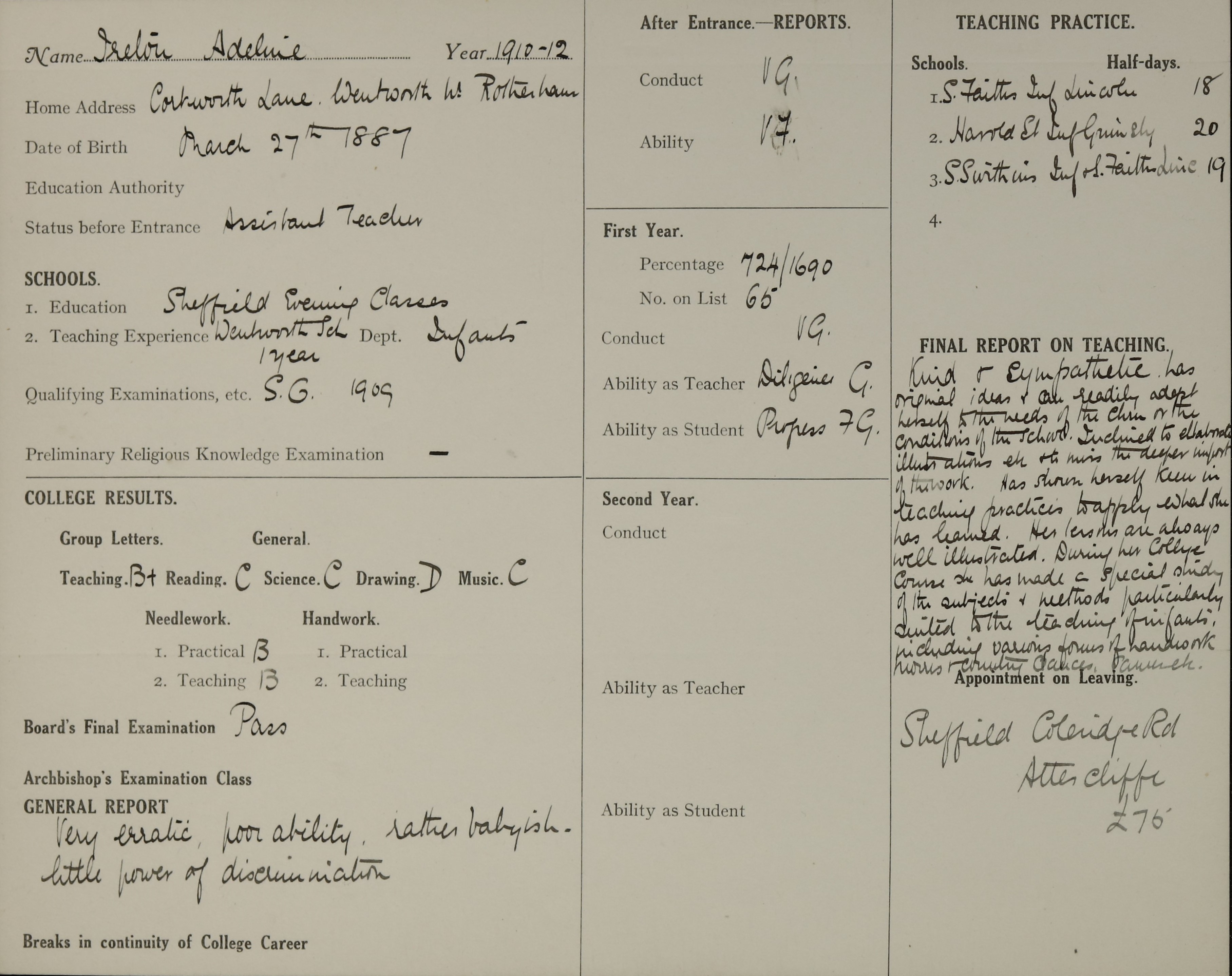 She is at 377 Glossop Road, Sheffield. Adeline is listed as ‘Assistant School Teacher’.