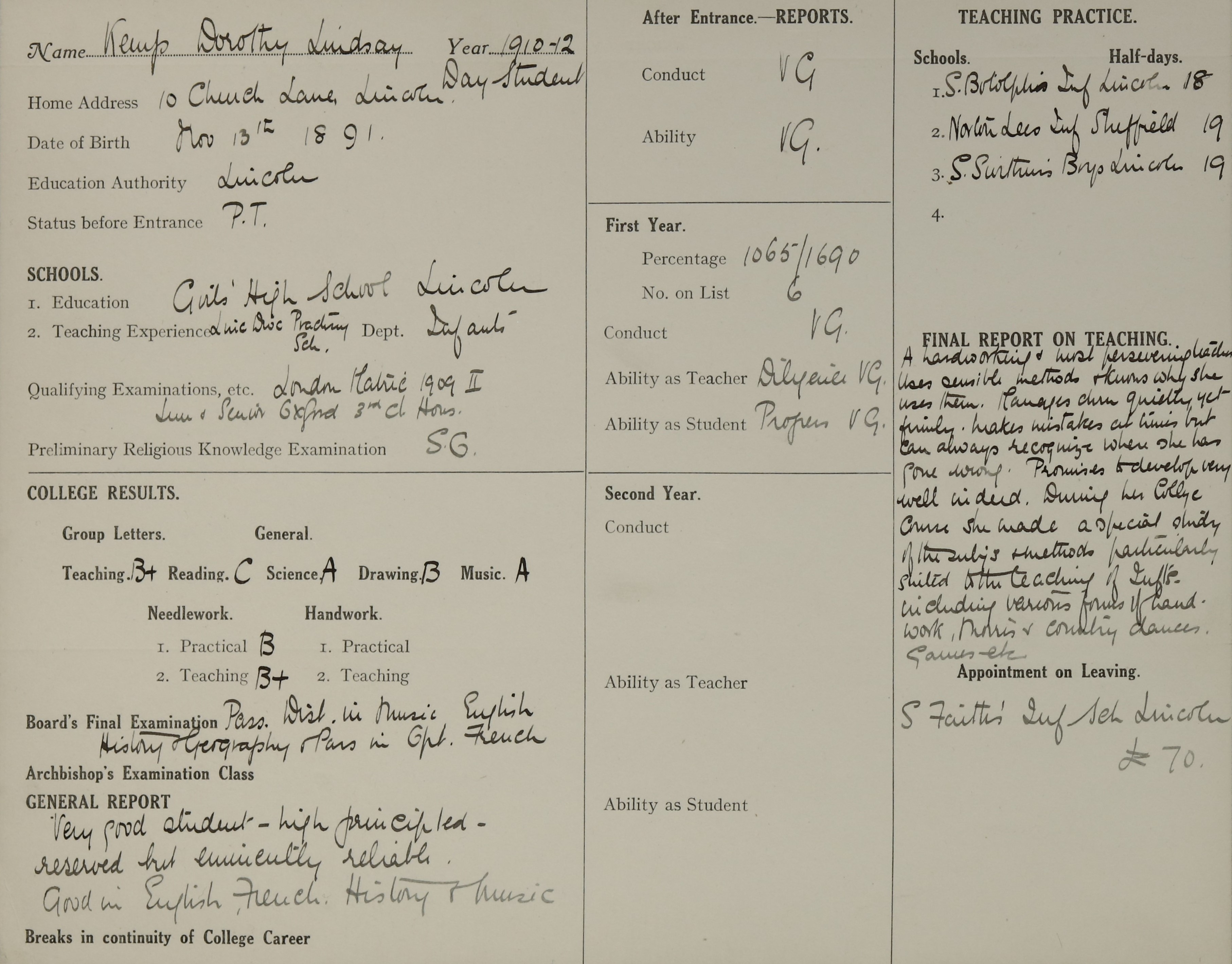 She is at 10 Church Lane, Lincoln. Her mother is listed as widow and ‘Small Private Means’. Dorothy is listed as ‘Student at Training College’. Her brother, Charles, is listed as ‘Bank Clerk’.