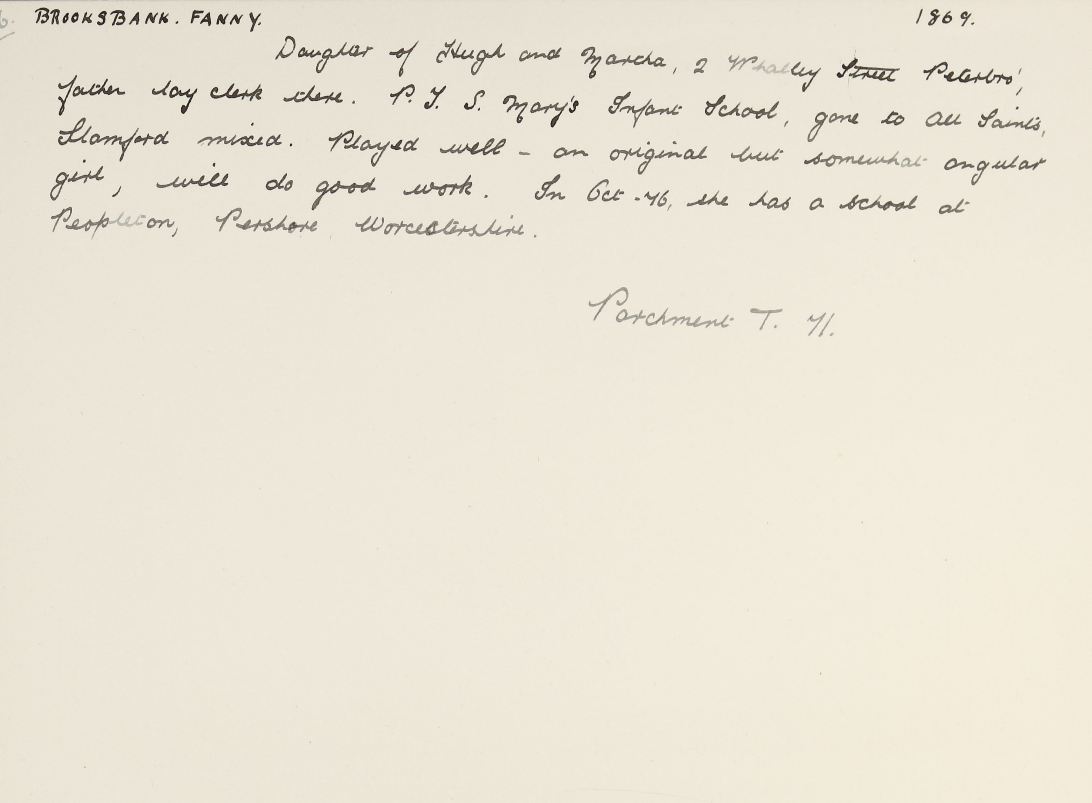 She is at Austin Street, All Saints, Stamford. Fanny is listed as ‘National School Mistress’. Mary A Orman (b. 1853) listed as boarder and ‘National School Monitor’.