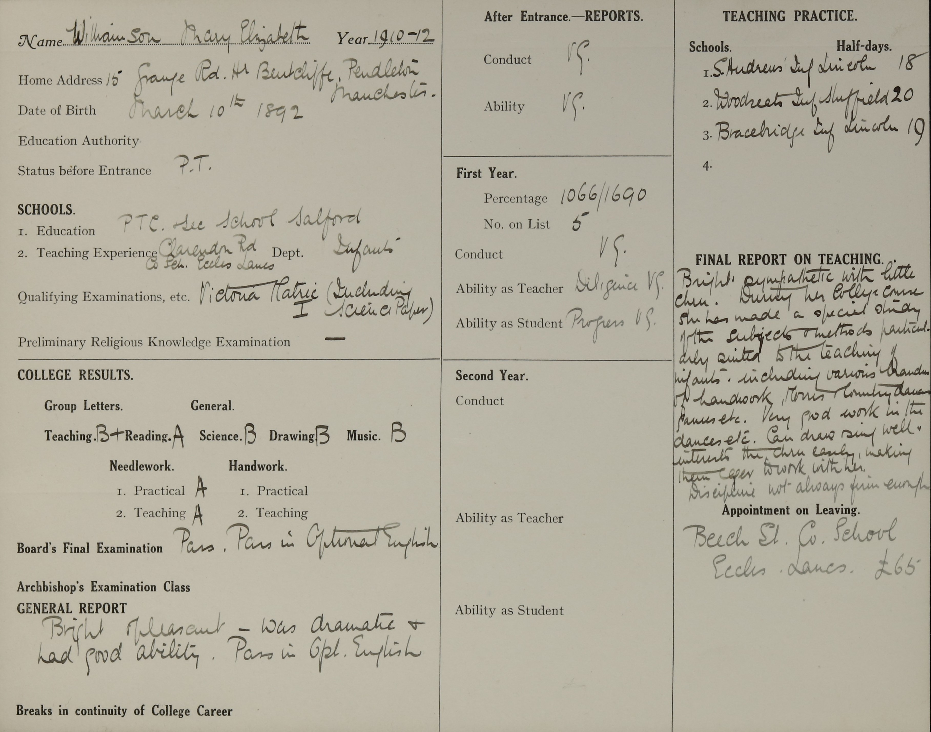 Appointed to Beech Street Council School, Eccles, Lancashire. £65.