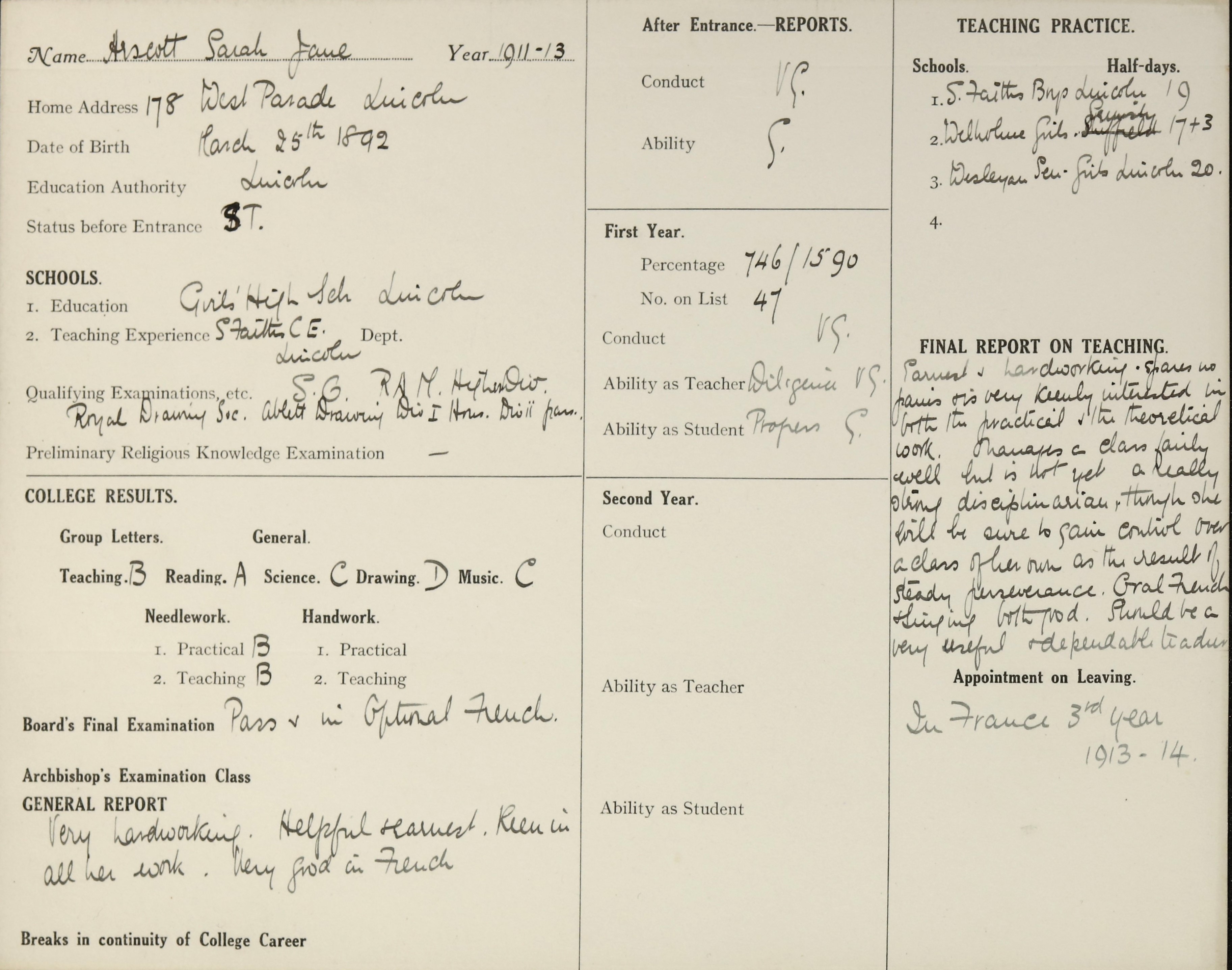 She is at 178 West Parade, Lincoln. Her father is listed as ‘Foreman Tailor’. Her sister, Mary, is listed as ‘Student at Training College’. Her sister, Margaret, is listed as ‘Pupil Teacher’. Her brother, William, is listed as ‘Mechanical Engineer’s Apprentice’. Sarah, her mother and brother, Joseph, are unlisted.