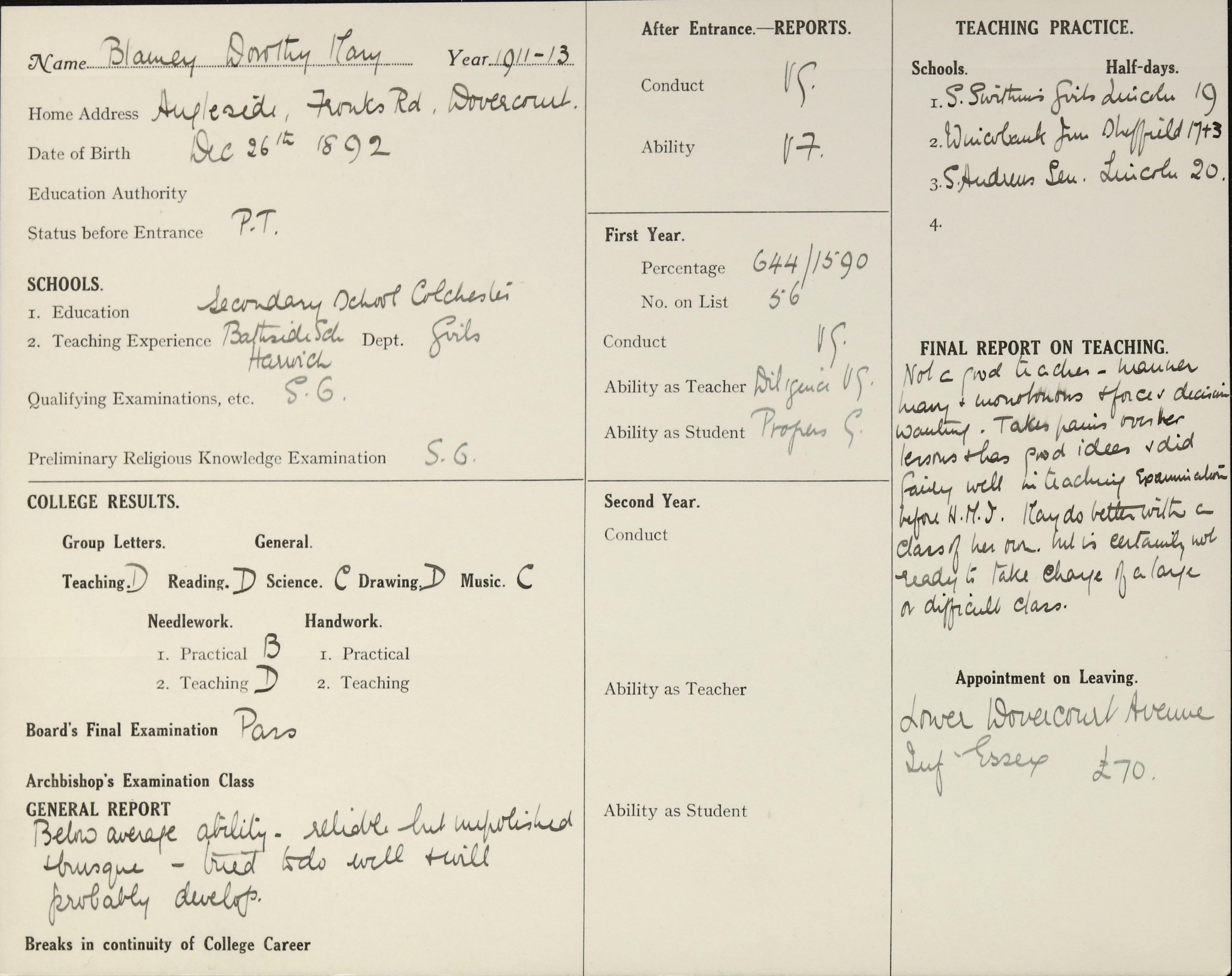 She is at Angleside Fronks Road, Dovercourt. Her father is listed as ‘Civil Servant of Customs’. Dorothy is listed as ‘Student Teacher, School Part-time’. Her mother and siblings (Marjorie, Kathleen and John) are unlisted.