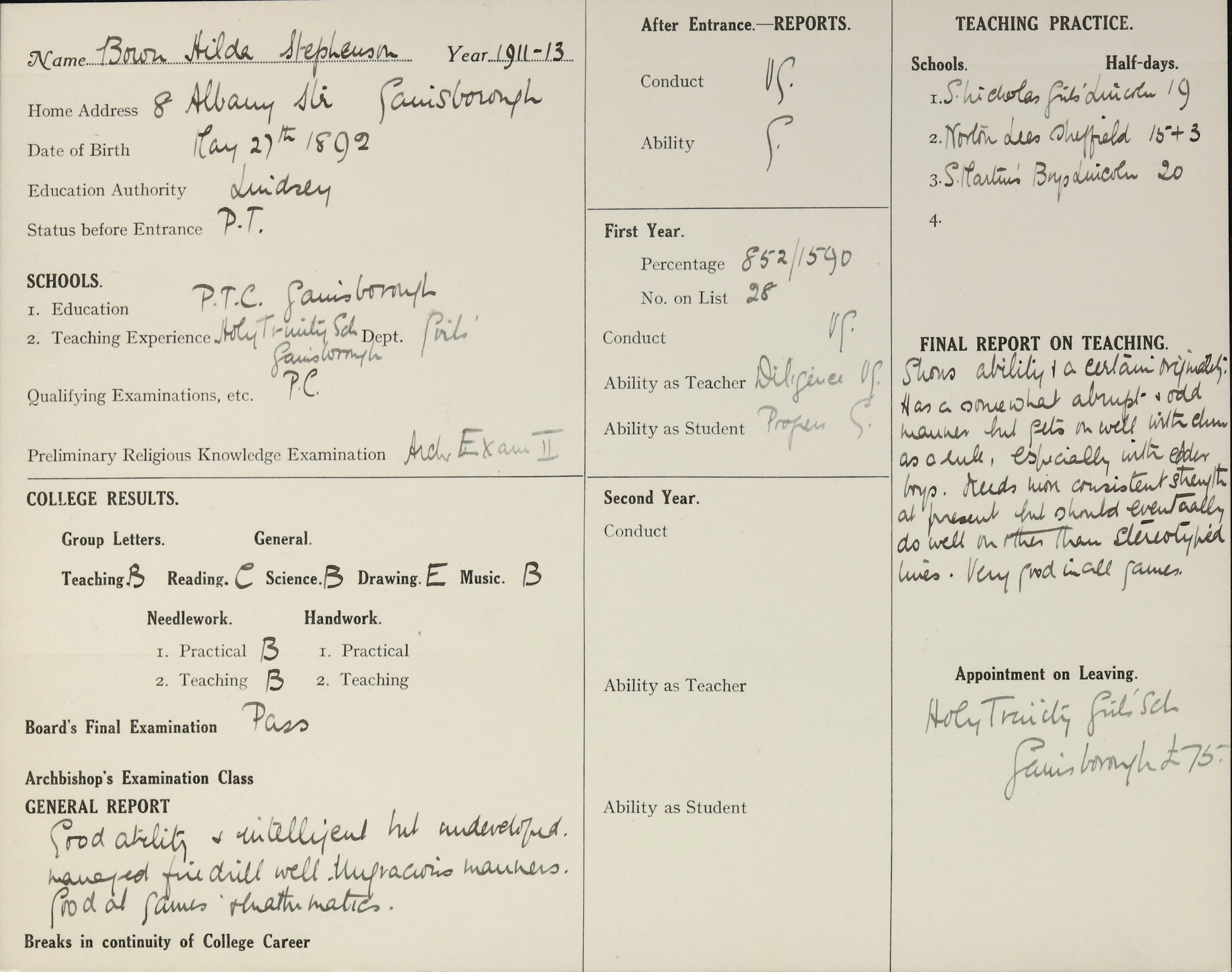 She is at 8 Albany Street, Gainsborough. Her father is listed as ‘Bootmaker’. Hilda and her brother, Arthur, are listed as ‘Student’. Her mother and her siblings, Edna, Derek and Ivor are unlisted.