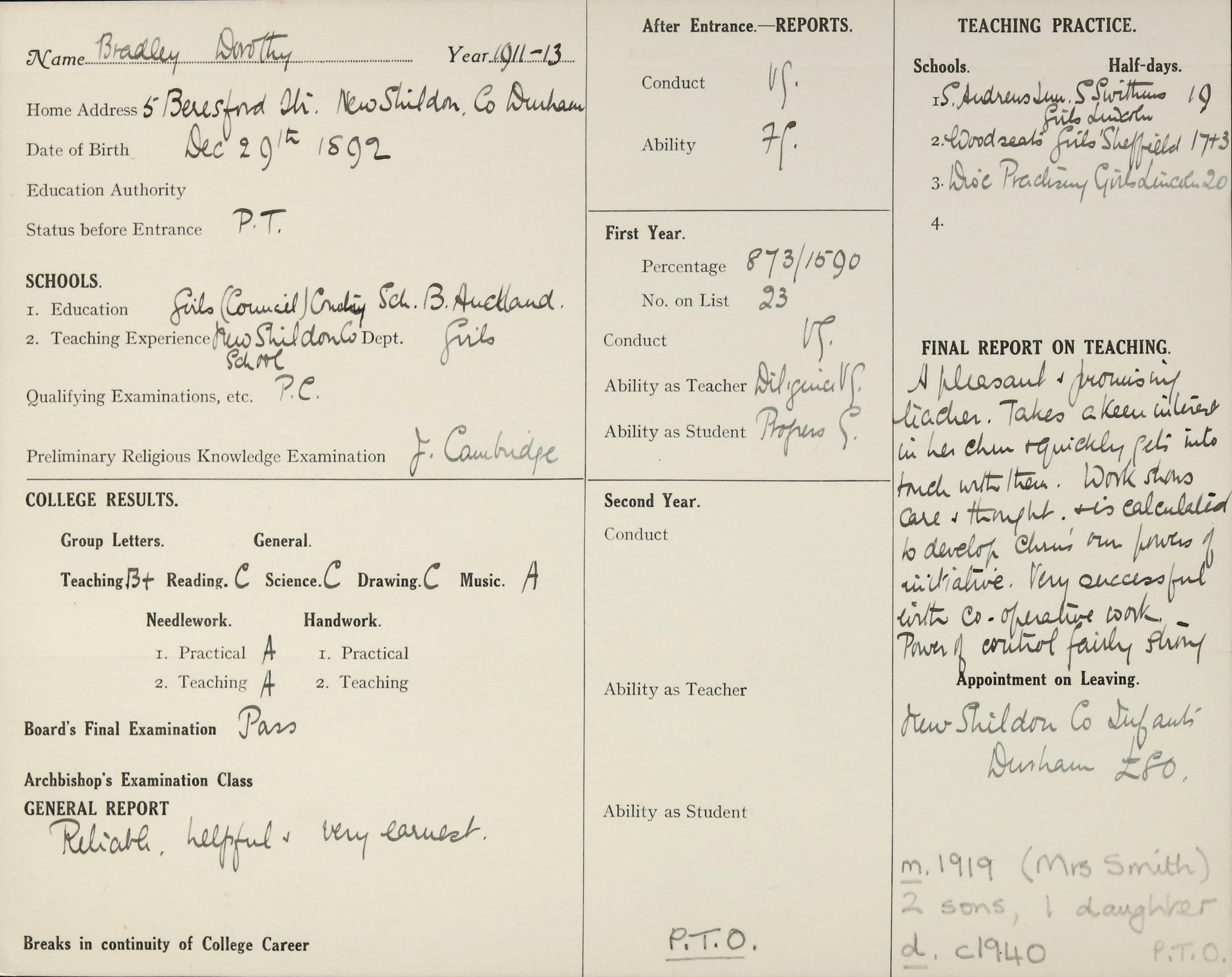 Appointed to New Shildon Council, Infants', Durham. £80.