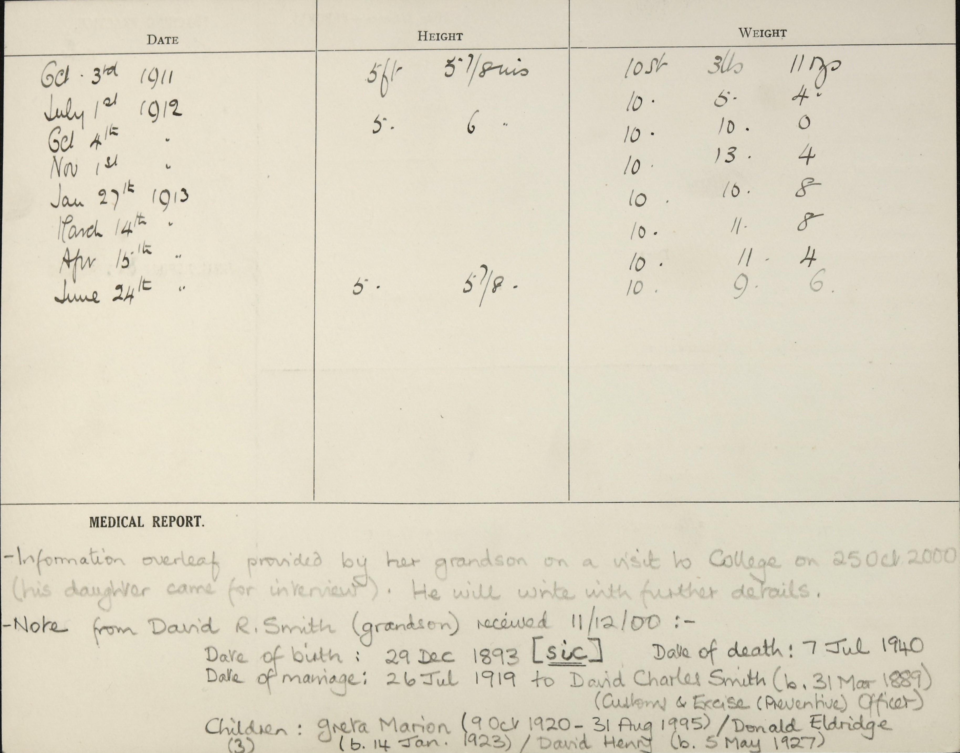 SMITH, Dorothy of 29 Harrow Road, Middlesbrough (wife of David Charles Smith) died 7 July 1940 at 26 Southfield Road, Middlesborough. Administration London 7 September to the said David Charles Smith, cutoms officer. Effects £812, 10s, 6d.