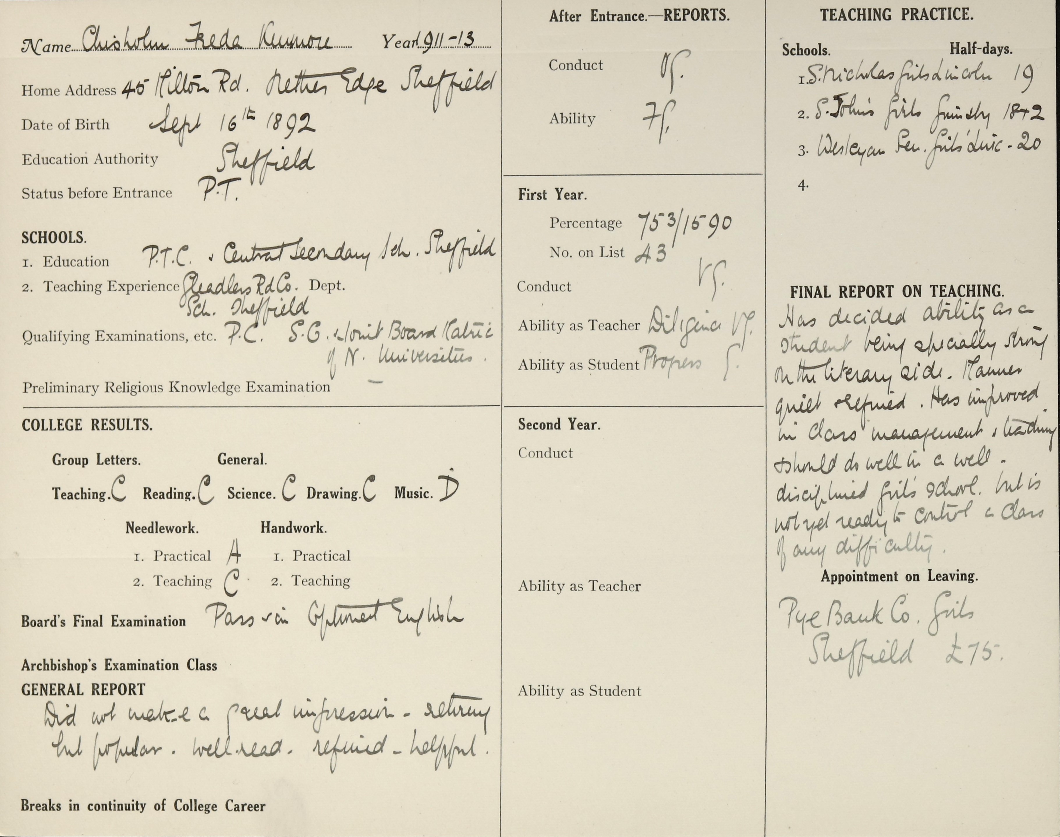 Appointed to Pye Bank Council Girls', Sheffield. £75.