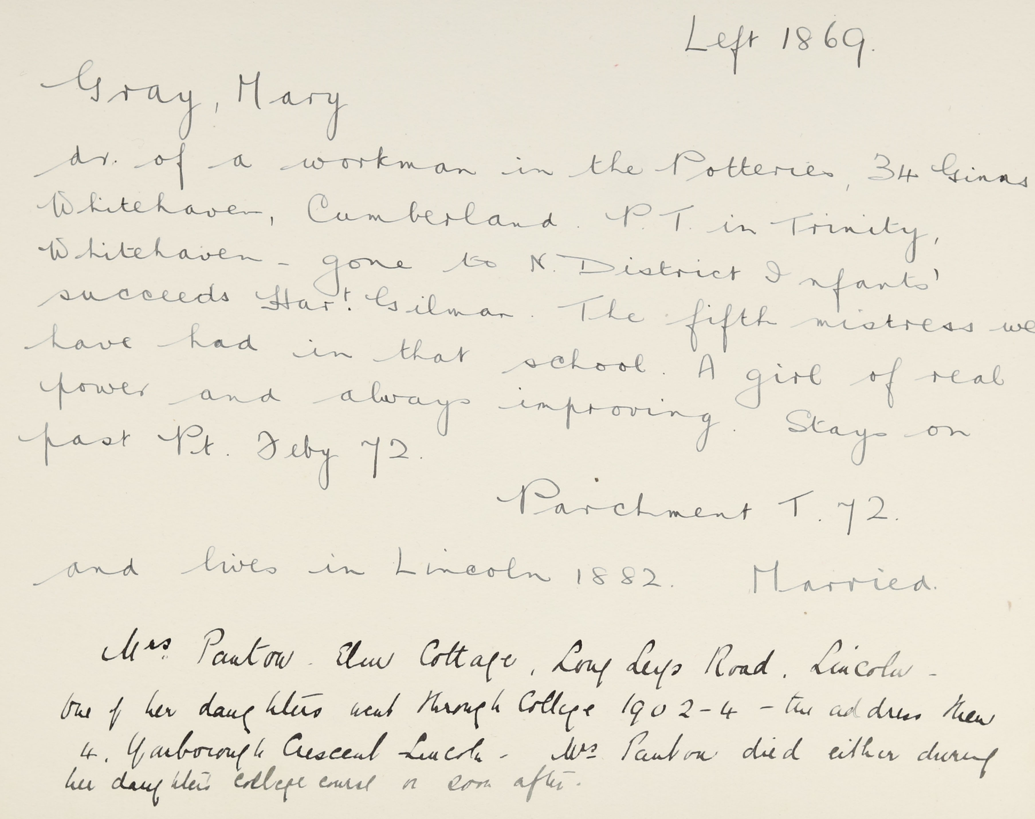 She is at 2 Rasen Lane, Lincoln. She is a boarder and listed as ‘Teacher’. Also, there is Betsey Birkett (b. 1848) [LDTC 1869], listed as ‘Teacher’.
