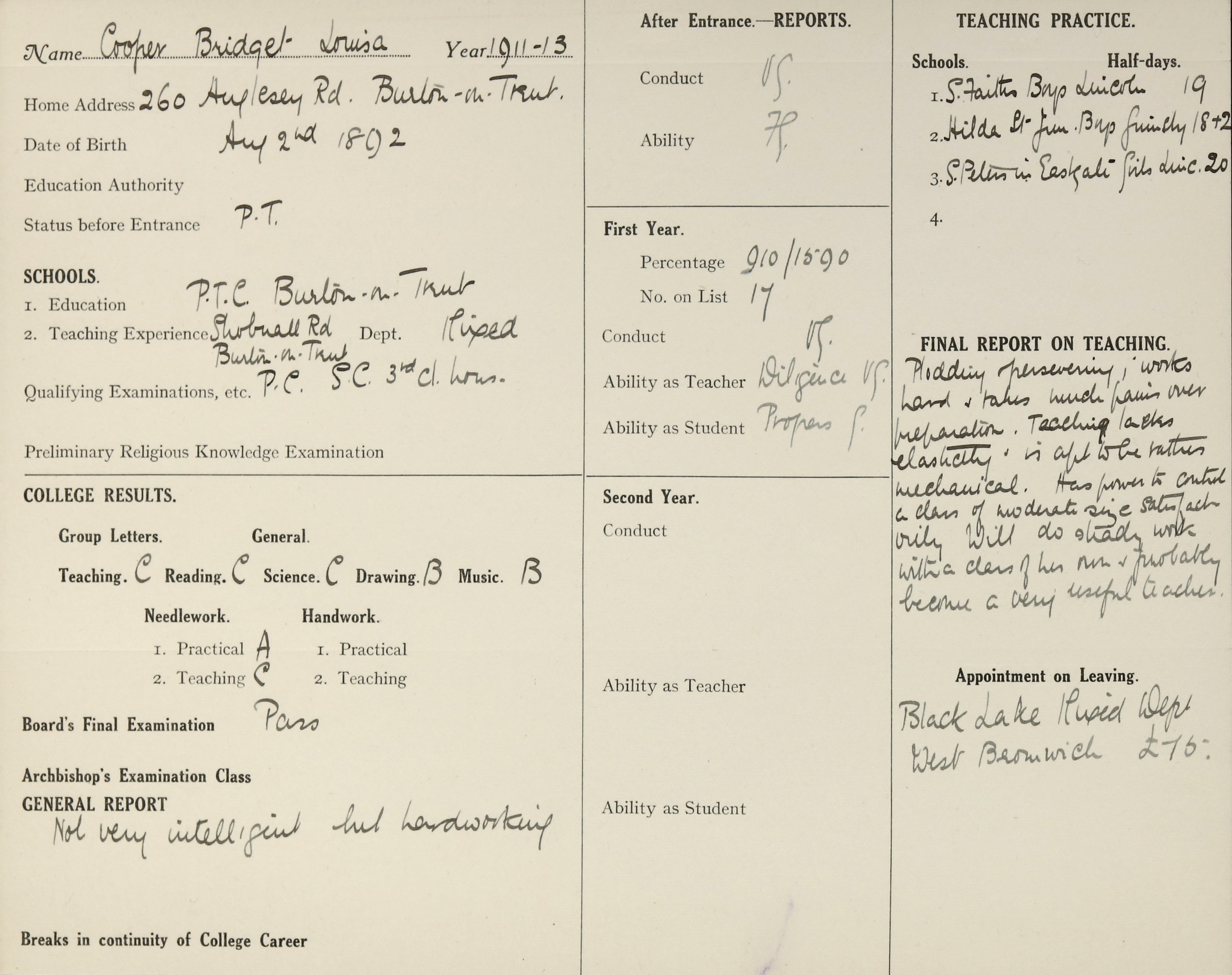 She is at 260 Anglesey Road, Burton on Trent. Her father is listed as ‘Cask Inspector’. Her brother, Theophilus, is listed as ‘Carriage Painter Apprentice’. Bridget is listed as ‘Pupil Teacher’. Her brother, William, is listed as ‘Clerk’. Her mother, grandmother, Bridget Louisa Cooper (b. 1831), and her sister, Elizabeth Irene Cooper (b. 1899), are unlisted.