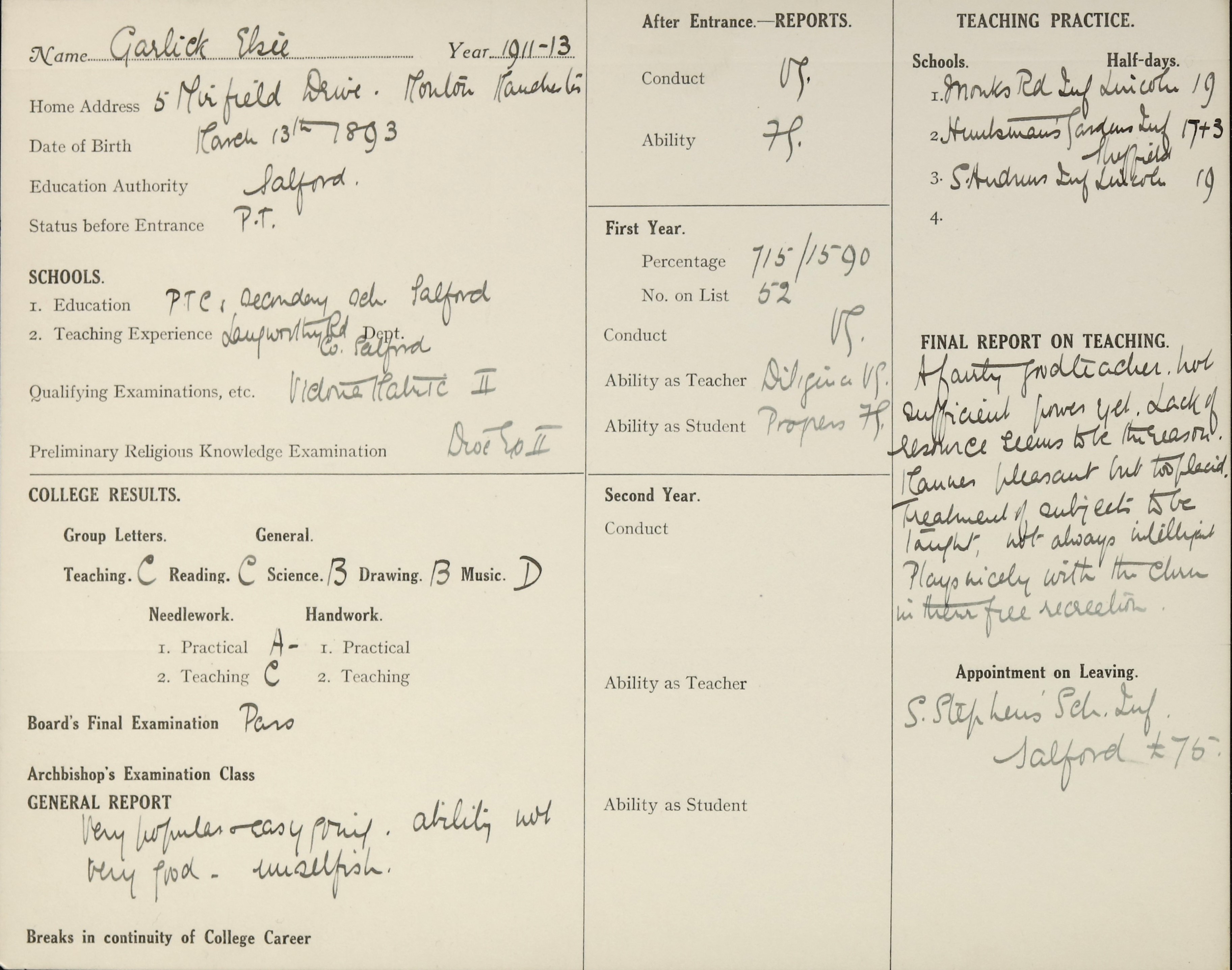 She is at 43 Trafford Road, Eccles & Barton. Her father is listed as ‘Carpet Salesman’. Elsie, her mother, her brother, Harold, and her aunt, Ellen G Garlick (b. 1881), are unlisted.