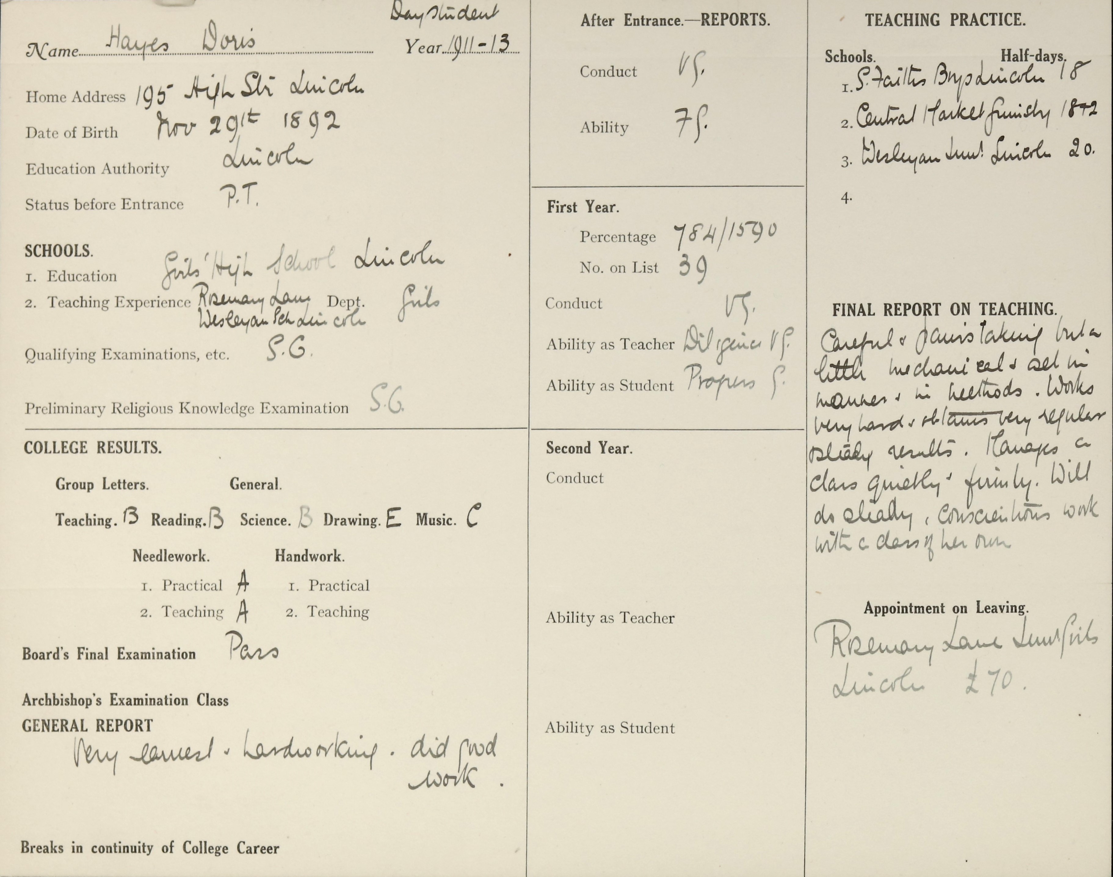 She is at 3 Motherby Lane, Lincoln. Her father is listed as ‘Gas Fitter’s Assistant’. Doris, her mother and siblings (Agnes and Bernard) are unlisted.