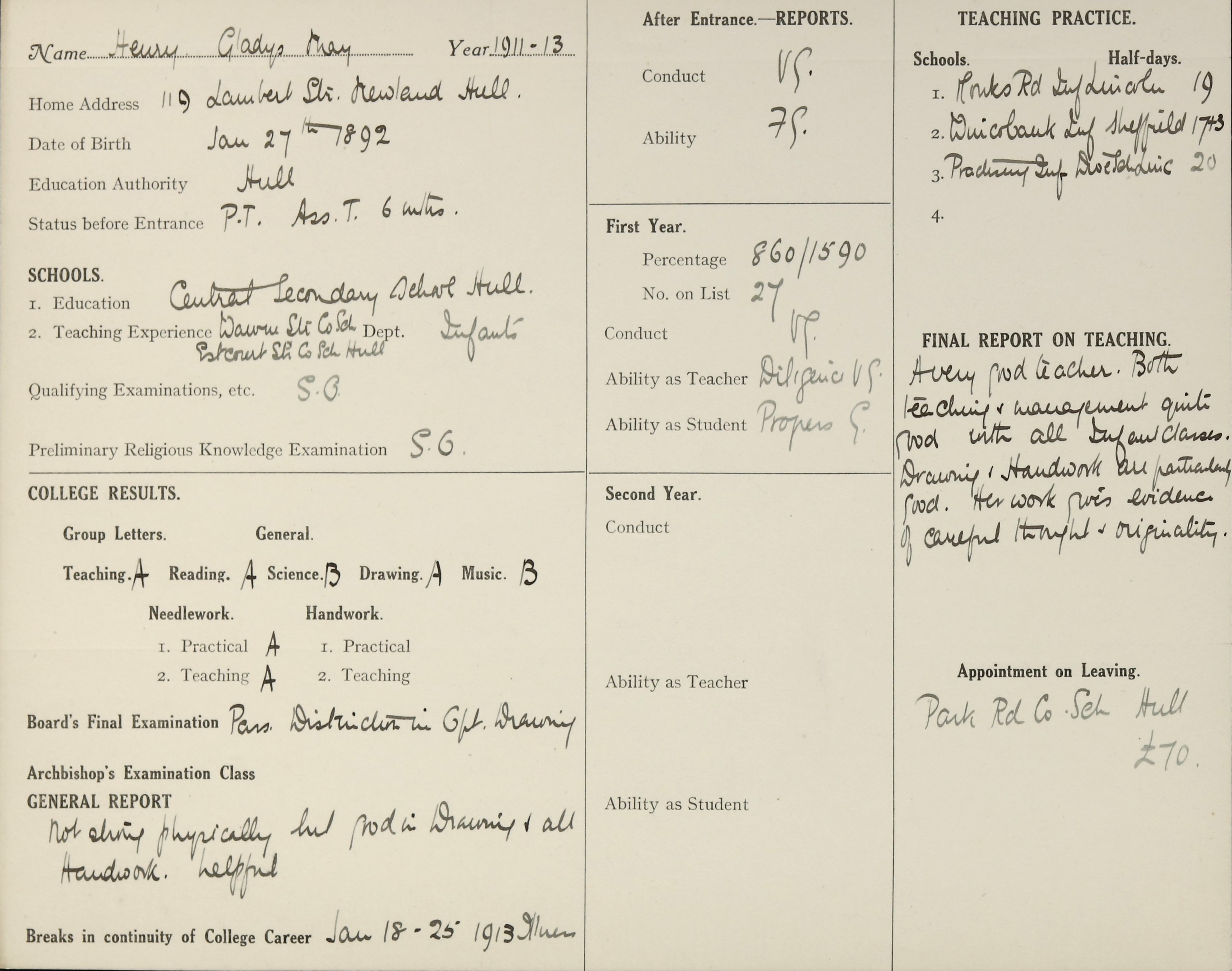 Appointed to Park Road Council School, Hull. £70.