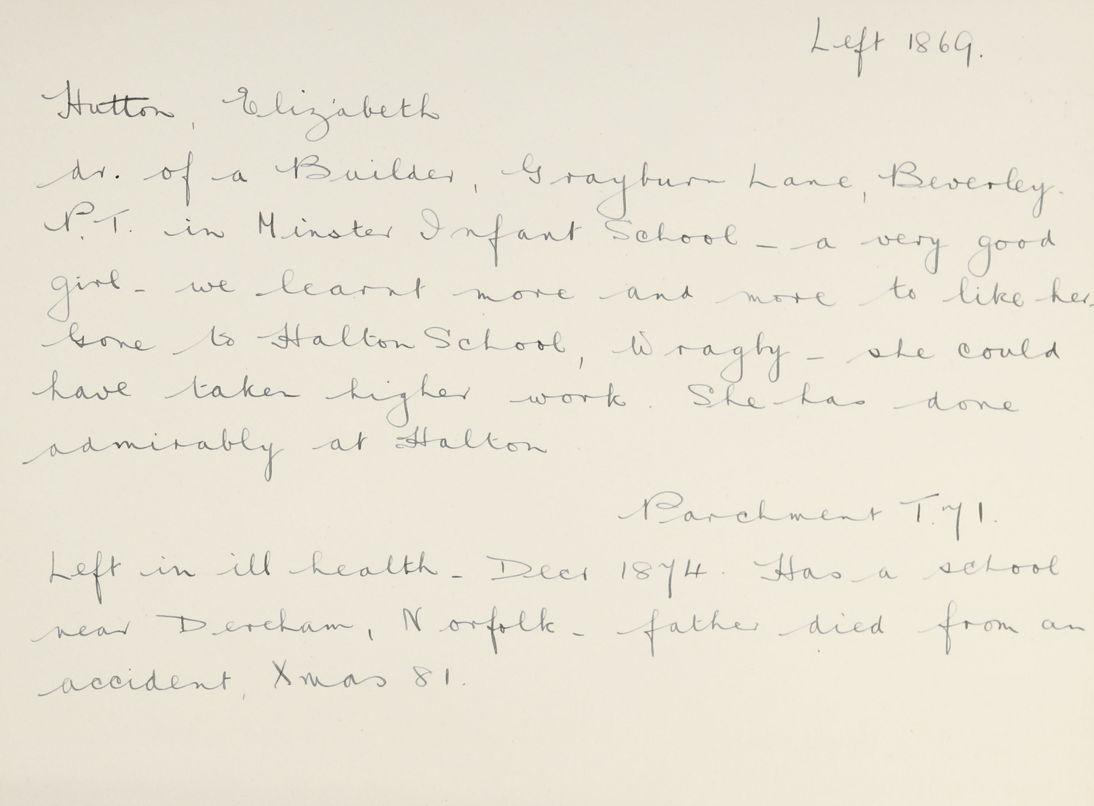 She is at Well Lane, St Martin, Beverley. The family are listed as ‘Hatton’. Her father is listed as ‘Bricklayer & Plasterer’. Her mother is listed as ‘Milliner & Dressmaker’. She and siblings (Charlotte A, James & Frances) are unlisted.