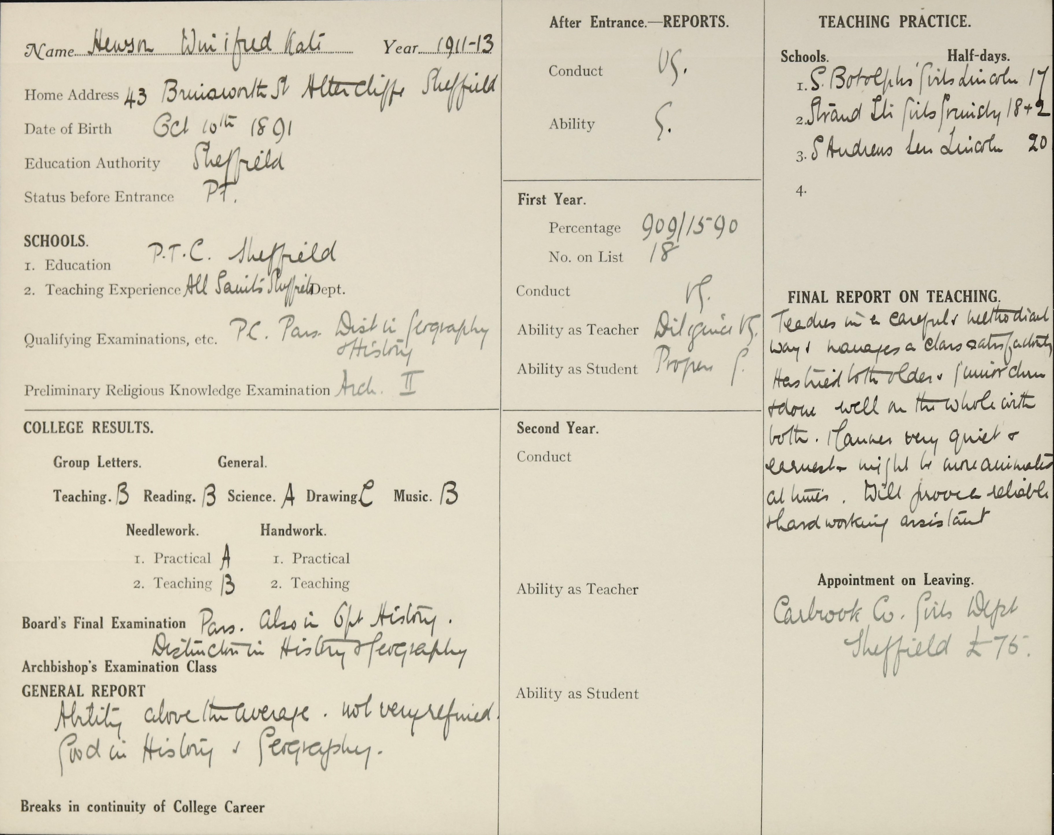 Appointed to Carbrook Council Girls' Department, Sheffield. £75.