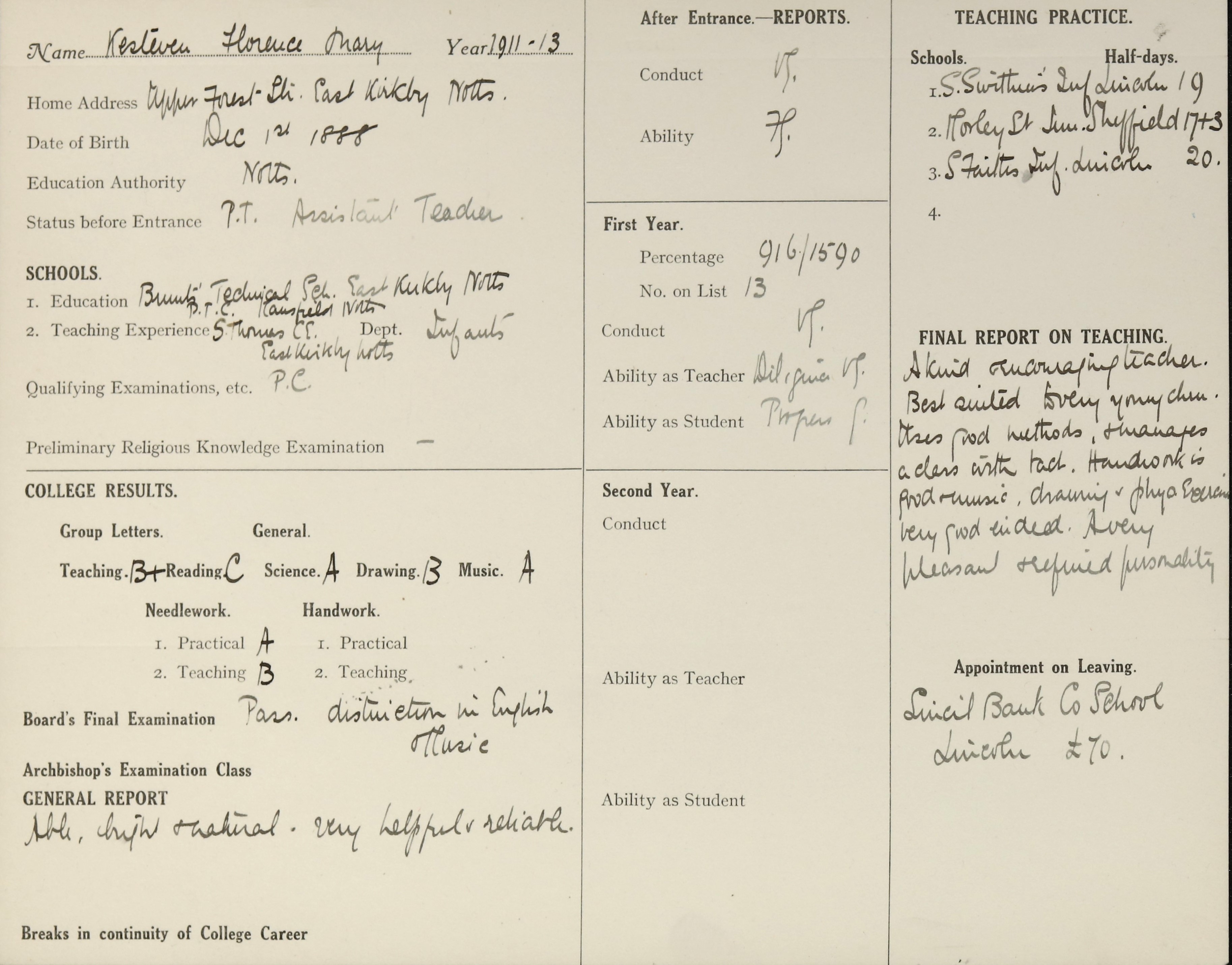 She is at 79 Cemetery Road, Kirkby. Her mother is an unlisted widow. Florence is listed as ‘School Teacher’.