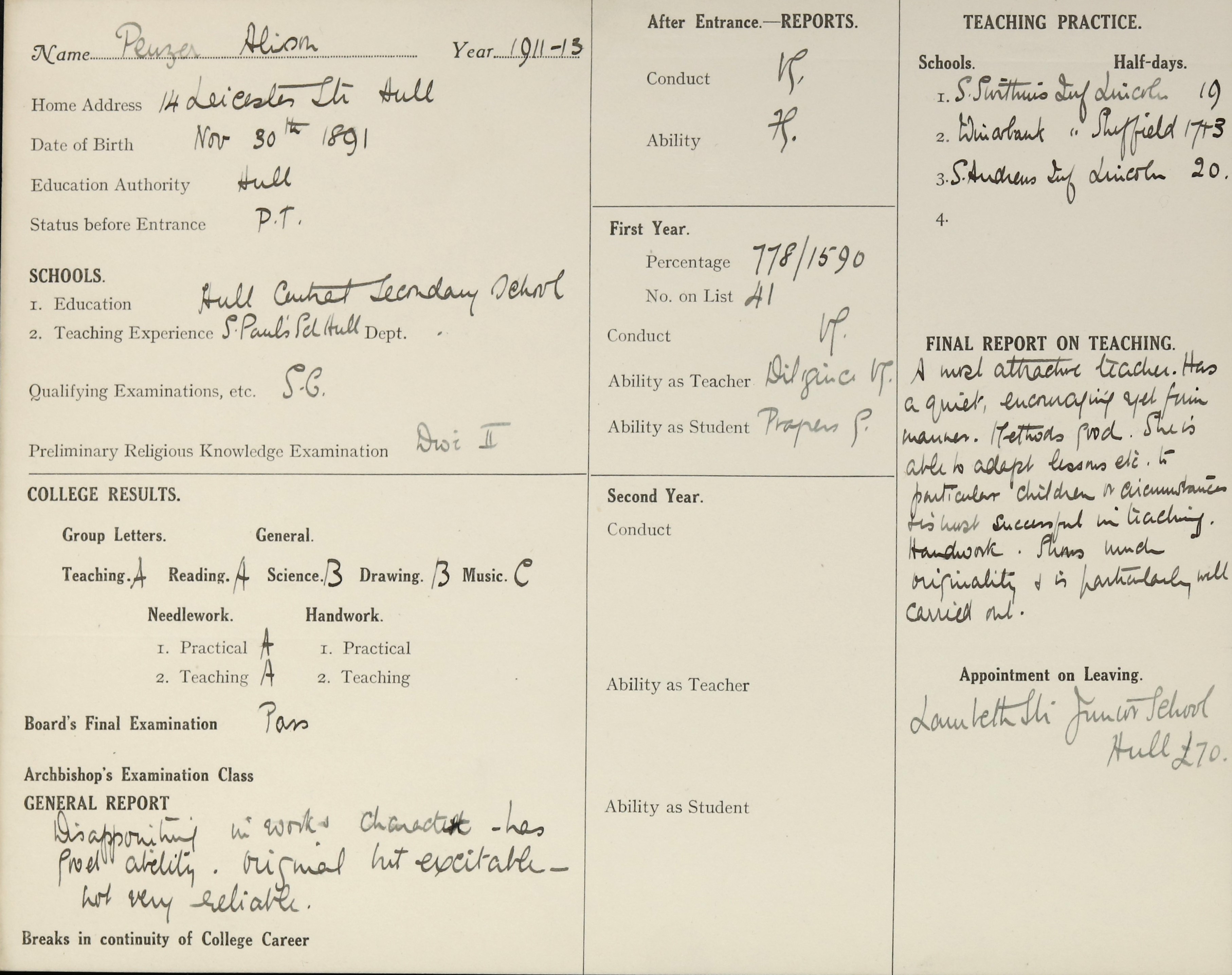 She is at 14 Leicester Street, Wellington Lane, Hull. Her father is listed as ‘Inland Revenue Officer 1st Class’. Her mother and sister, Dorothea, are unlisted. Her sister, Winifred, is listed as ‘Schoolmistress’. Alison is listed as ‘Pupil Teacher’. Her brother, Frank, is listed as ‘Student’.