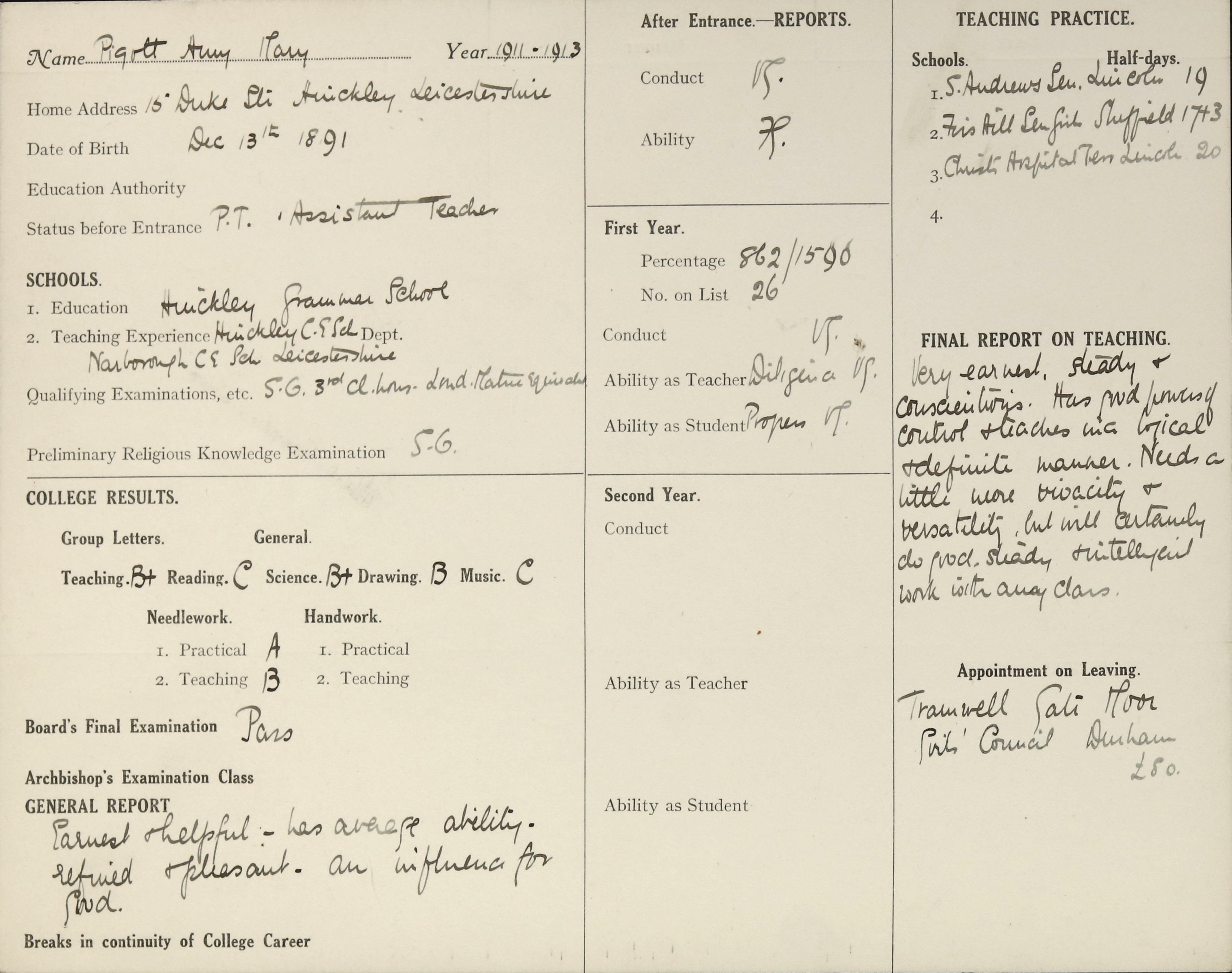She is at 15 Duke Street, Hinckley, Leicestershire. Her father is listed as ‘Bootmaker Dealer’. Her mother is unlisted. Amy is listed as ‘Elementary School Teacher’. Her sister, Myrnie, is listed as ‘Shop Assistant’.