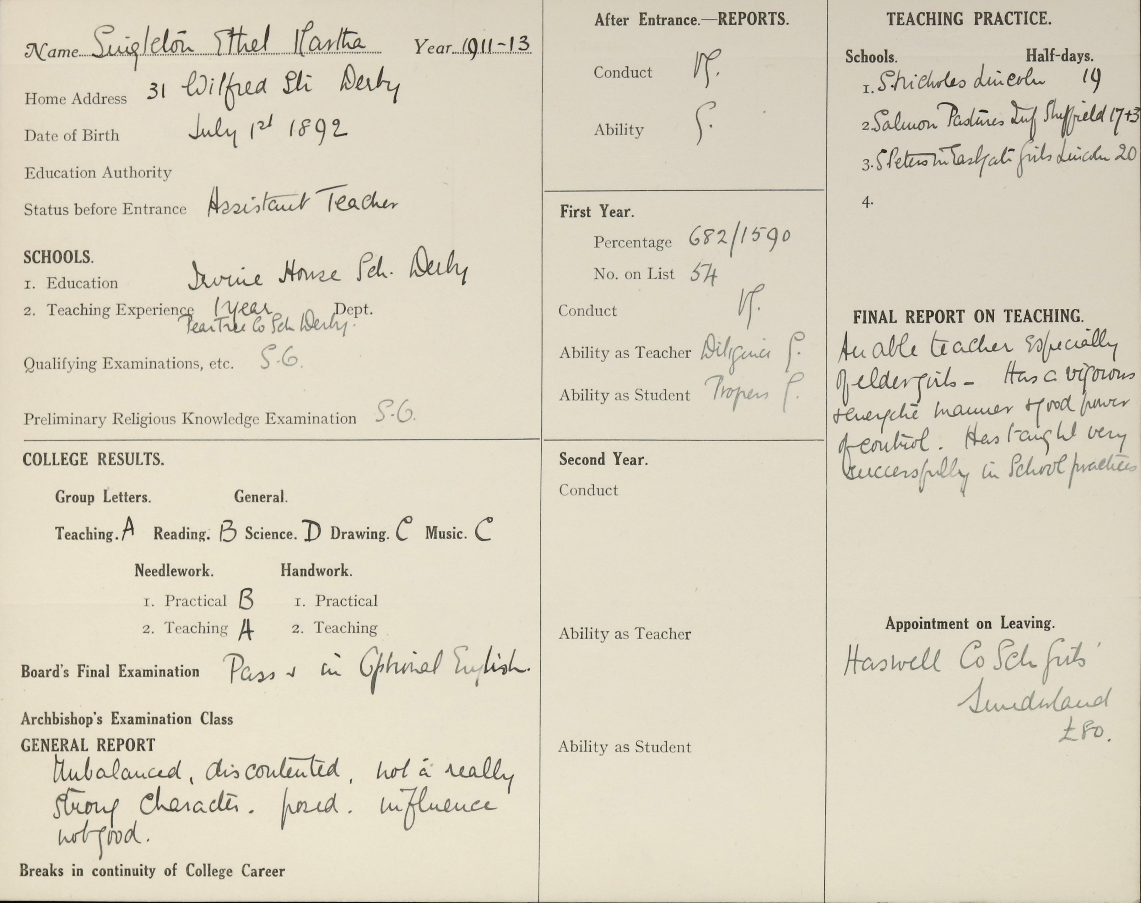 She is at 31 Wilfred Street, Derby. Her father is listed as ‘Railway Clerk’. Ethel is listed as ‘School Teacher’. Her sister, Katherine, is listed as ‘Apprentice Mantle Making’. Her mother and siblings (Herbert, Margaret and Frederick) are unlisted.