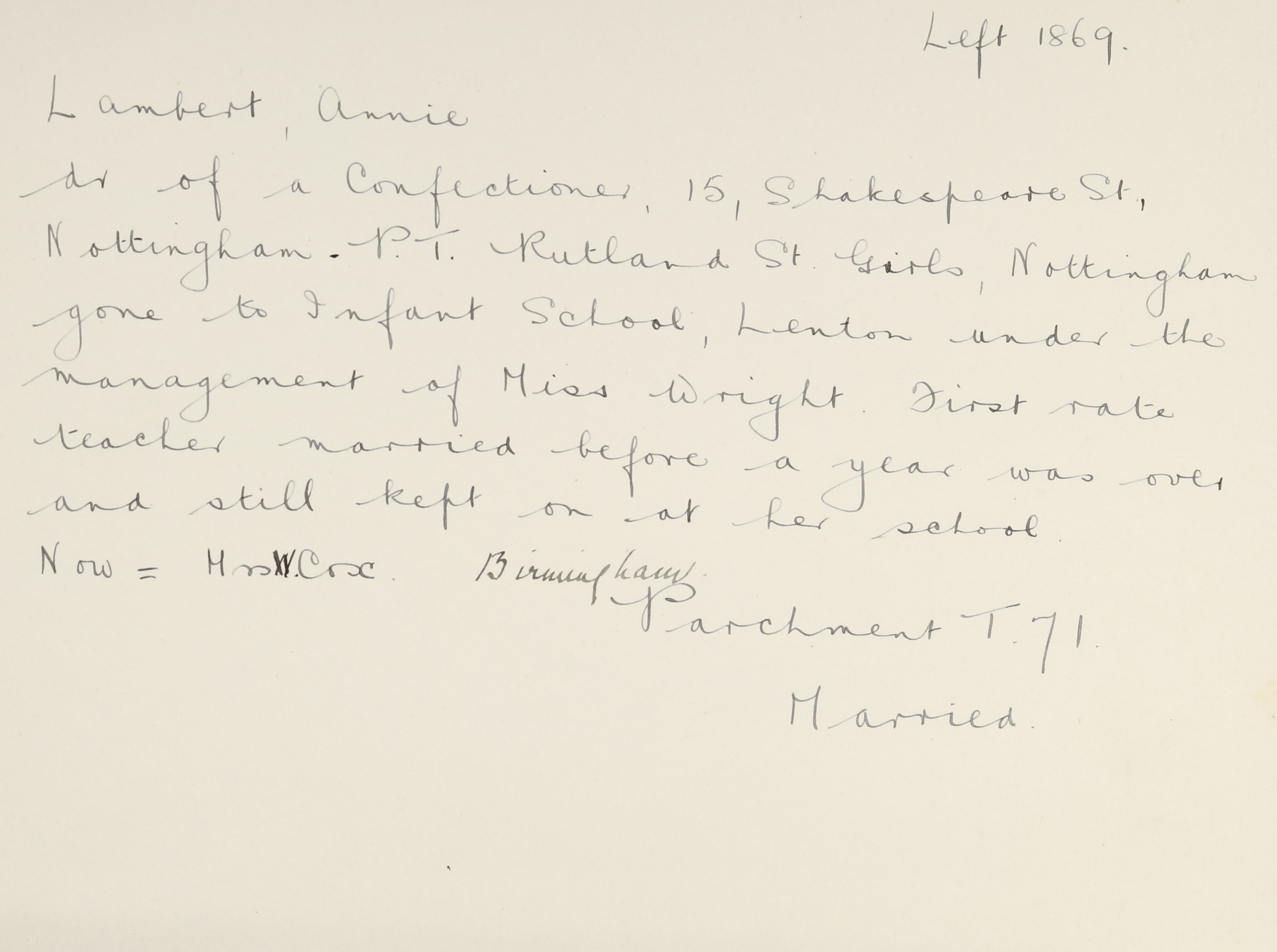 She is at Shakespeare Street, St Mary, Nottingham. Her father is listed as ‘Confectioner’. Annie, her mother and sisters (Louisa, Sarah and Jane) are unlisted. Her sister, Mary, is a ‘Saleswoman’.