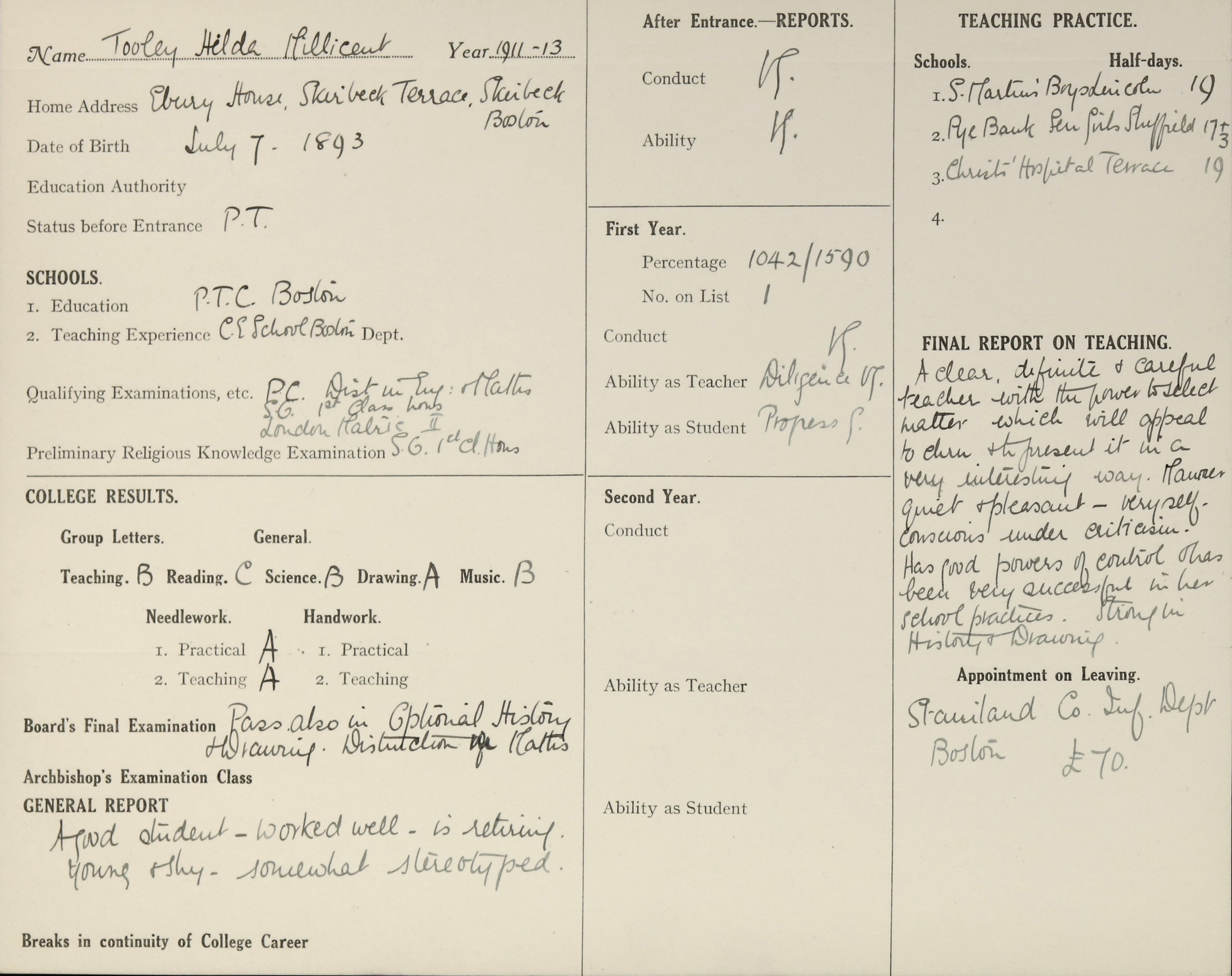 She is at 32 Spilsby Road, Boston. Her father is listed as ‘Preventative Officer Customs and Excise Retired’. Her mother is unlisted. Her sister, Muriel, is listed as ‘Teacher of Pianoforte and Singing’. Hilda and her sisters, Fanny and Lily, are all listed as ‘Head Teachers’.