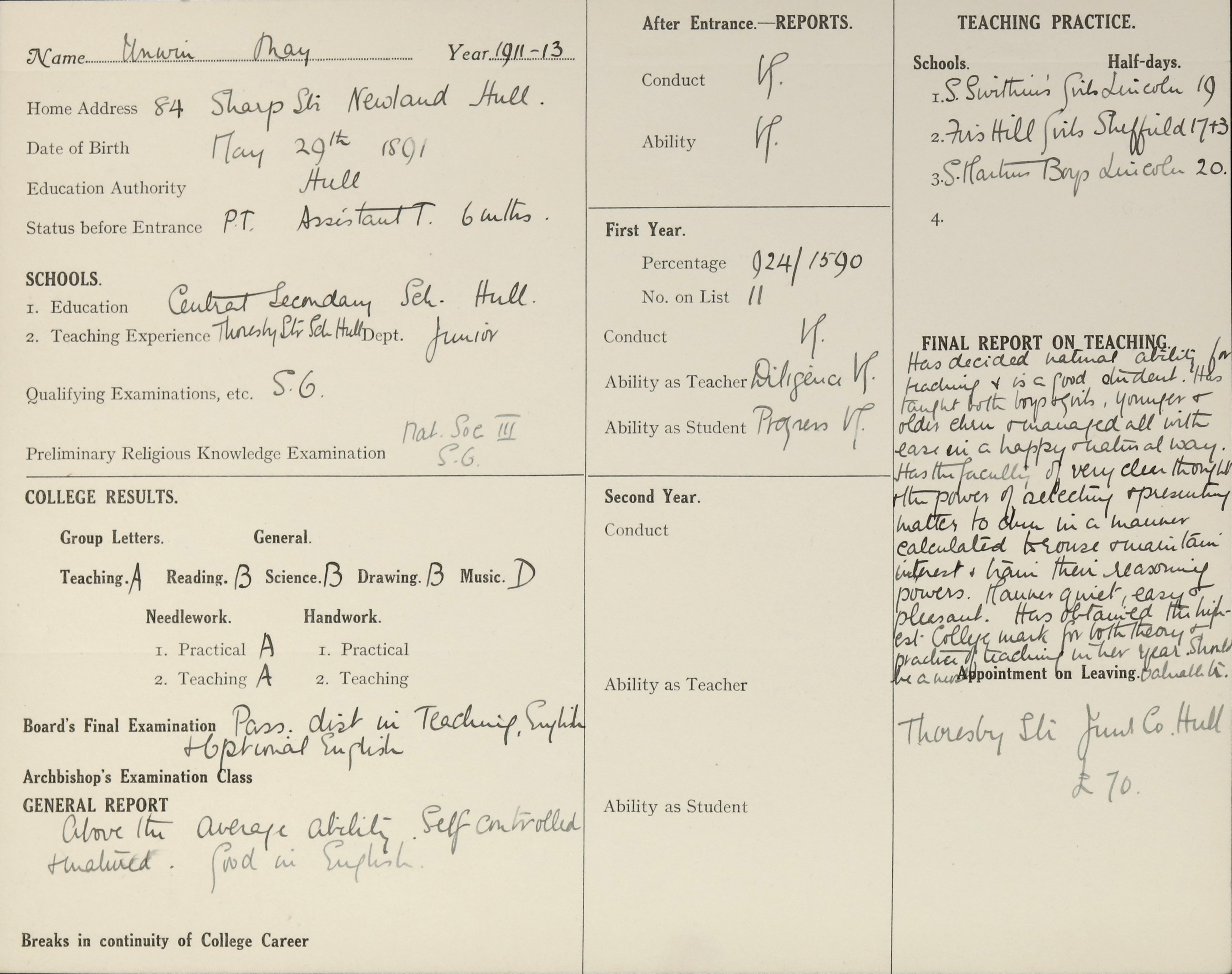 Appointed to Thoresby Street Junior Council School, Hull. £70.