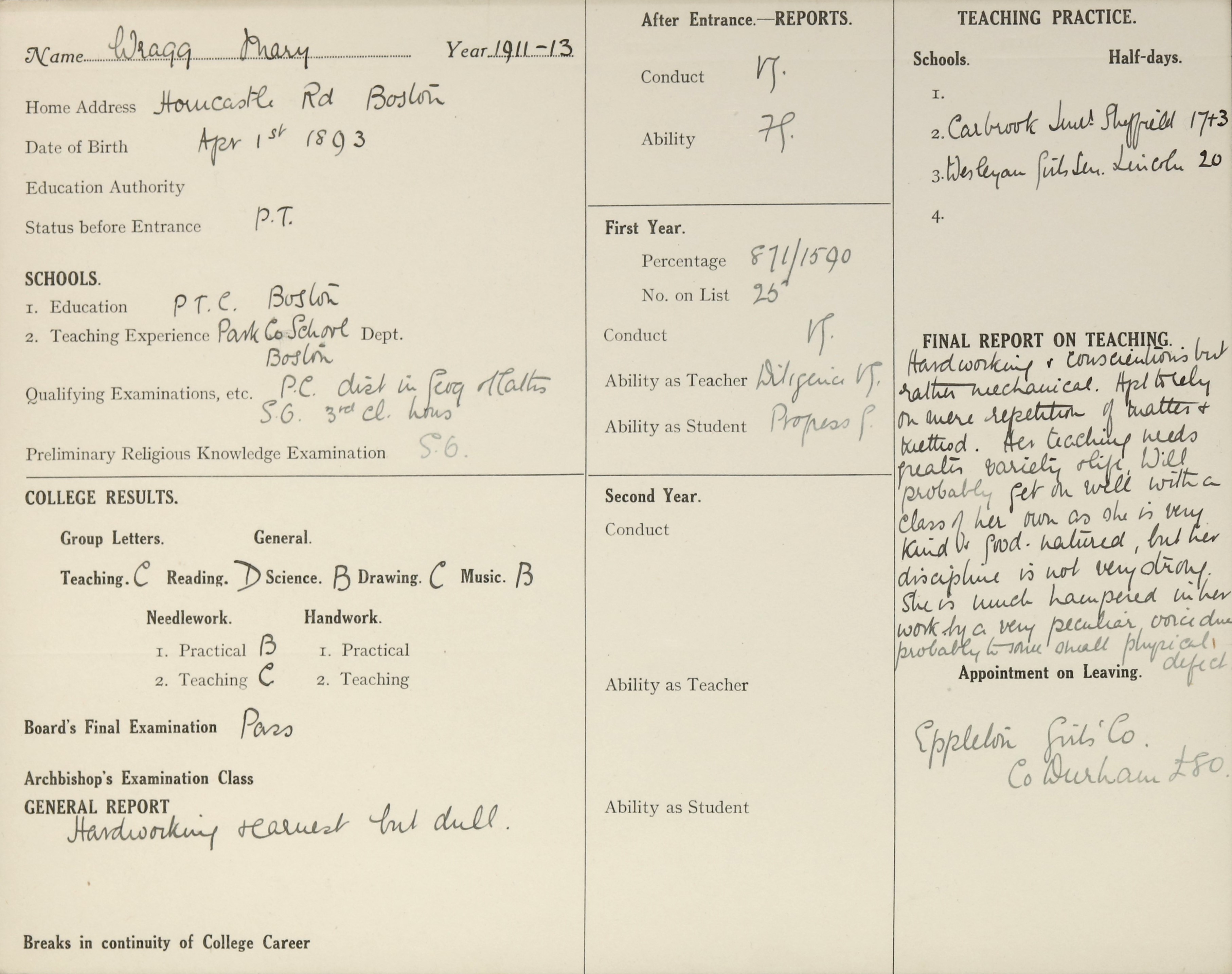 She is at Horncastle Road, Skirbeck. Her father is listed as ‘Grocer’. Her mother is unlisted. Mary is listed as ‘Trained Certificated Head Teacher’. Her brother, George, is listed as ‘Gardener’.