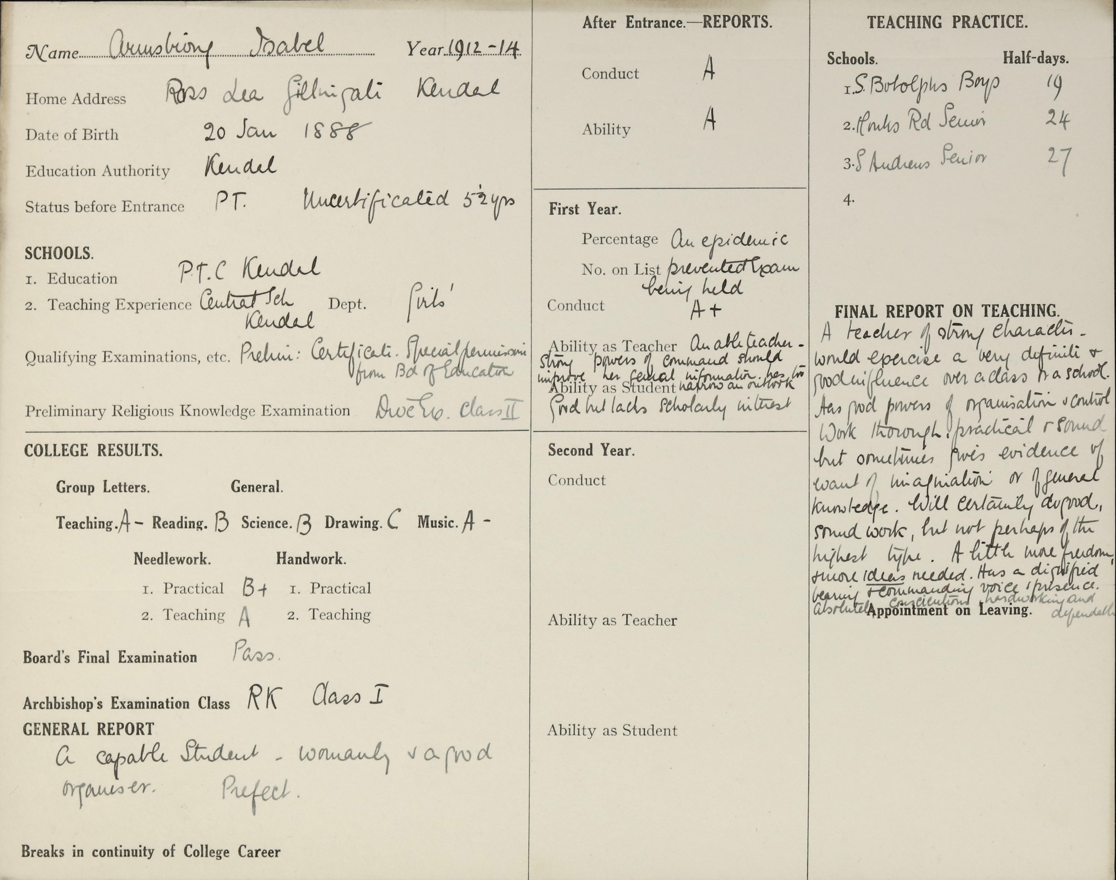 She is at 18 Gillingate, Kendal. Her mother is an unlisted widow. Isabel is listed as ‘Elementary School Teacher’.