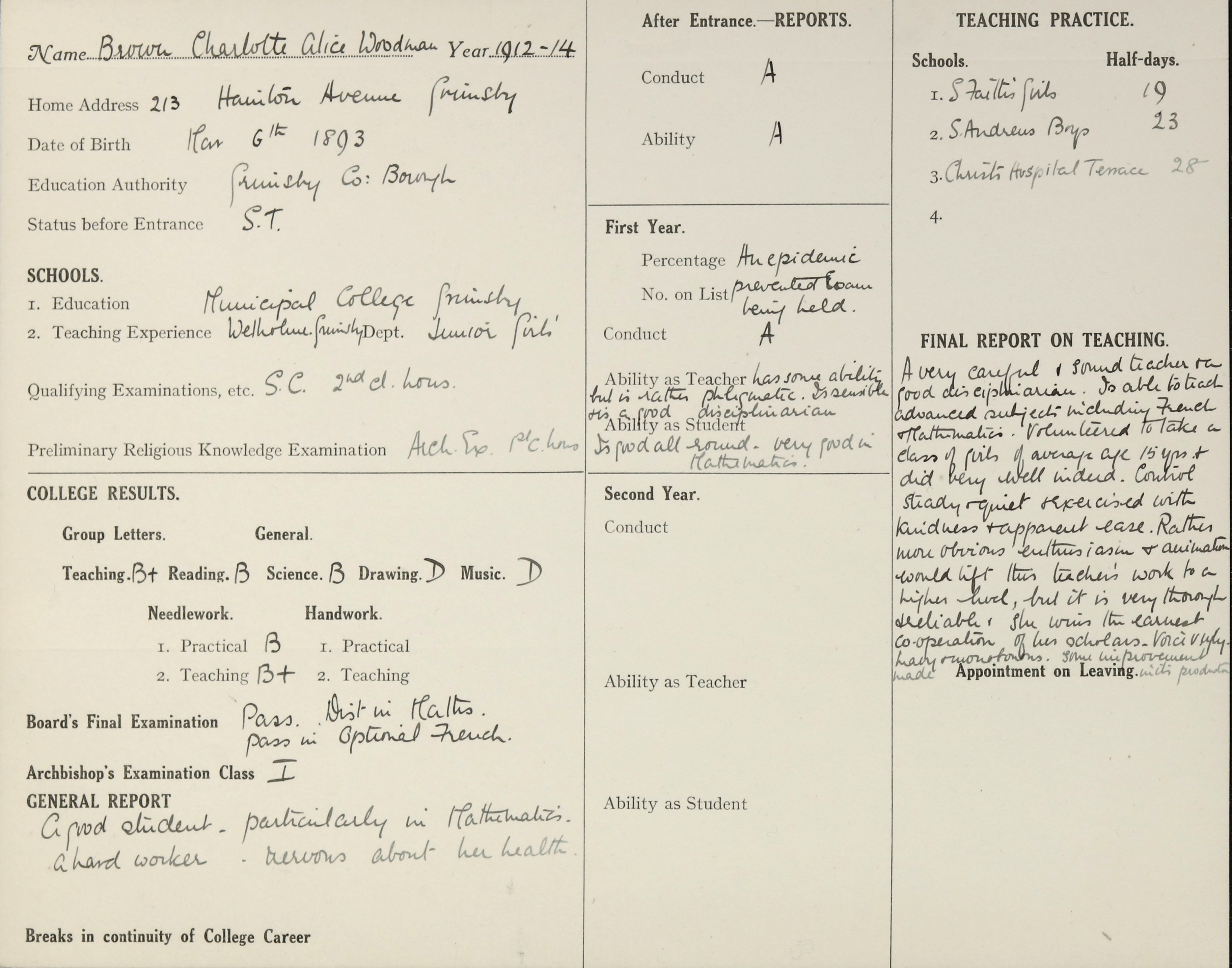 She is at 213 Hainton Avenue, Grimsby. Her mother is listed as widow and ‘Incapacitated’. Her sister, Rosa, is unlisted. Charlotte is listed as ‘Certificated Teacher’.