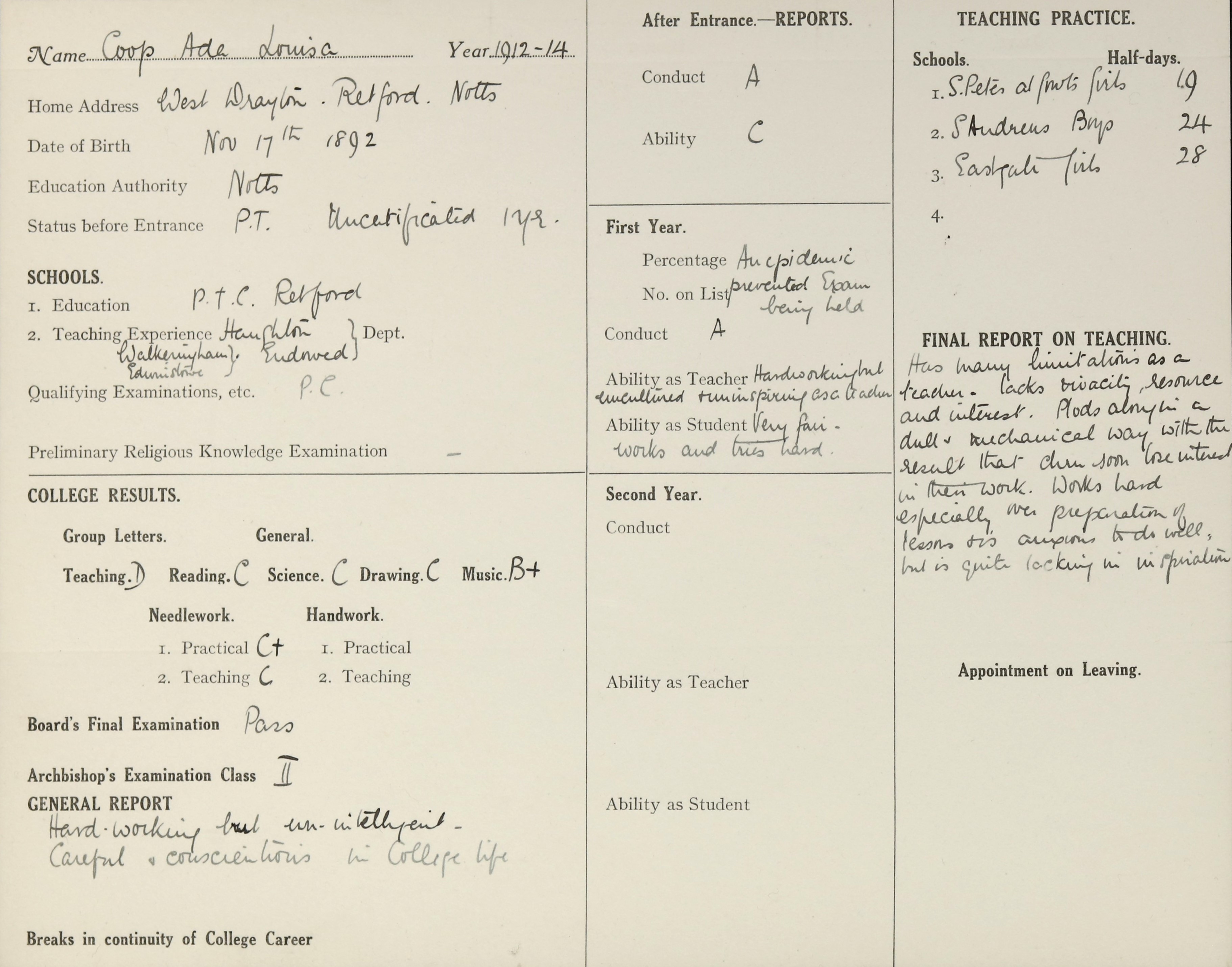 She is at West Drayton, Retford. Her father is listed as ‘Farm Labourer’. Ada is listed as ‘Student Teaching Profession’. Her mother is unlisted.
