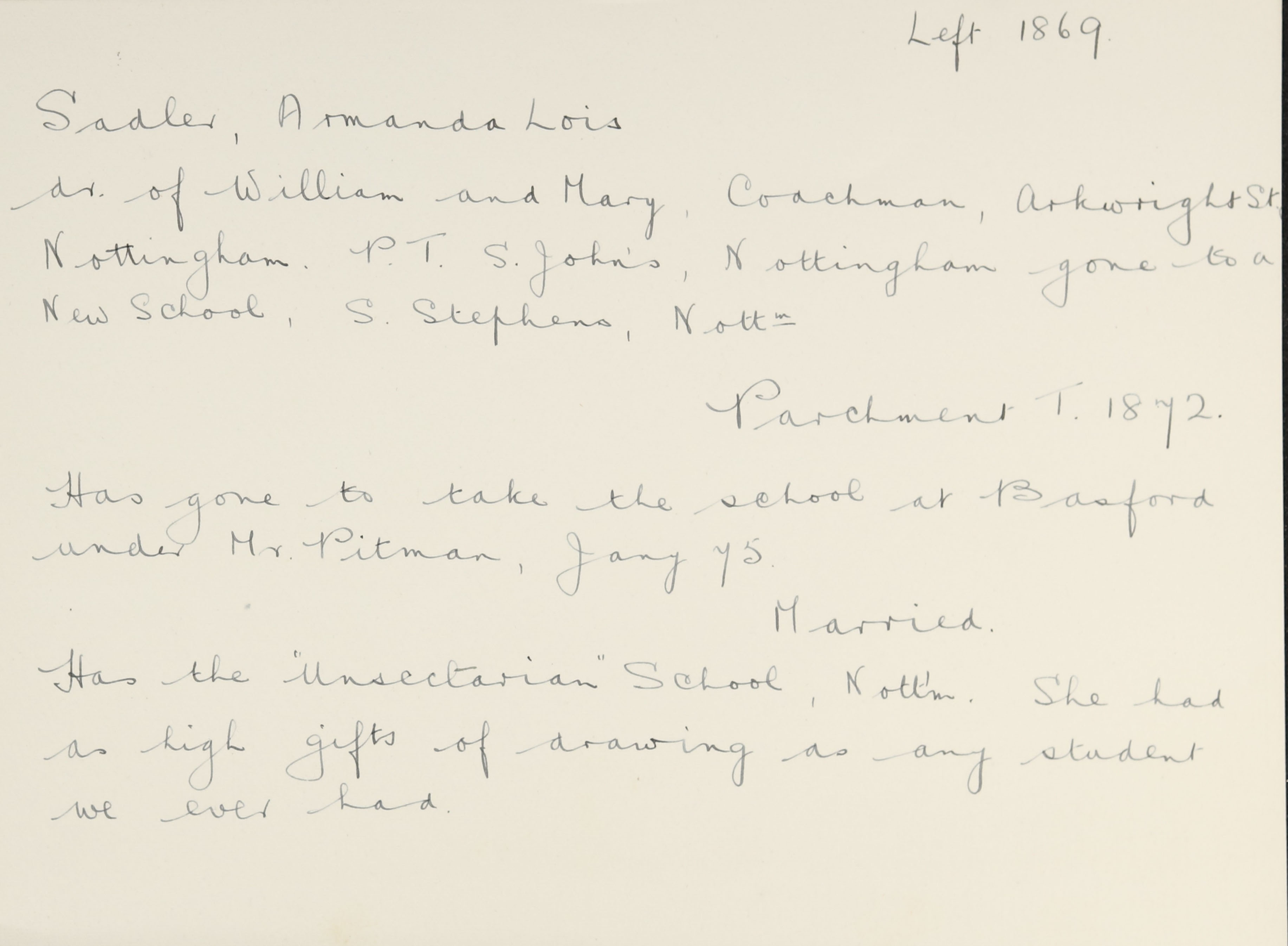 She is at 55 Blackstone Street, Nottingham. Her mother is listed as a widow. Her brother, Albert, has married and is listed as ‘Turner at Machine Works (E&M)’. Her sister-in-law, Emily M Sadler (b. 1852), is unlisted. She has three nieces and a nephew all are unlisted (Edith Sadler (b. 1872), Amanda Sadler (b. 1876), Mabel Sadler (b. 1877) and Albert W Sadler (b. 1877)). Amanada is listed as visitor and ‘Teacher in School’.