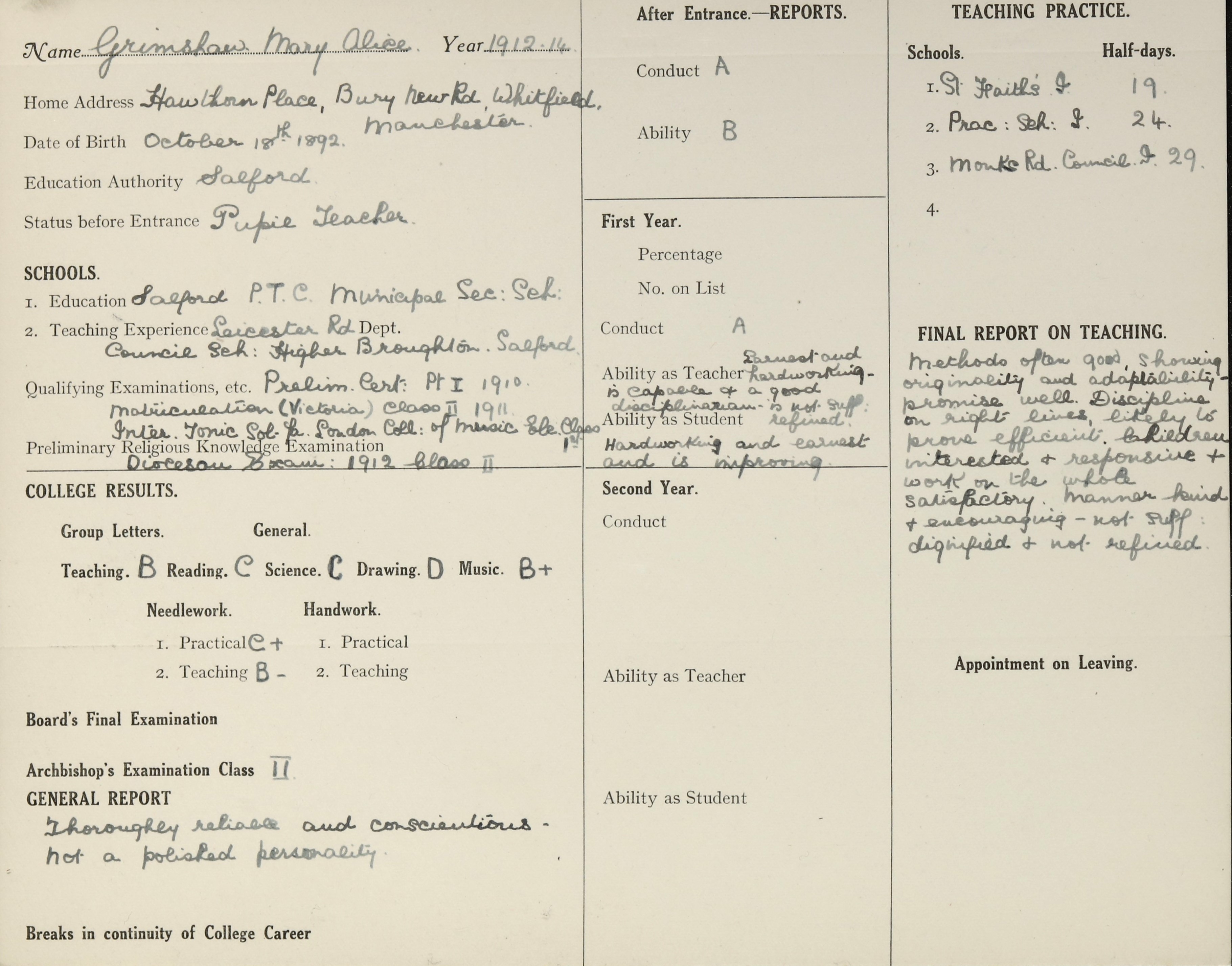 She is at 186 Bury New Road, Whitefield. Her mother is an unlisted widow. Her brother, Fred, is listed as ‘Monumental Mason Manager’. Her sister, Laura, is listed as ‘Dressmaker’. Her sister, Ada, is listed as ‘Typewriter’. Her sister, Terrie, is listed as ‘Apprentice Confectioner’. Her sister, Carrie, is unlisted. Mary is listed as ‘Student Part Time and School Teacher Part Time’.
