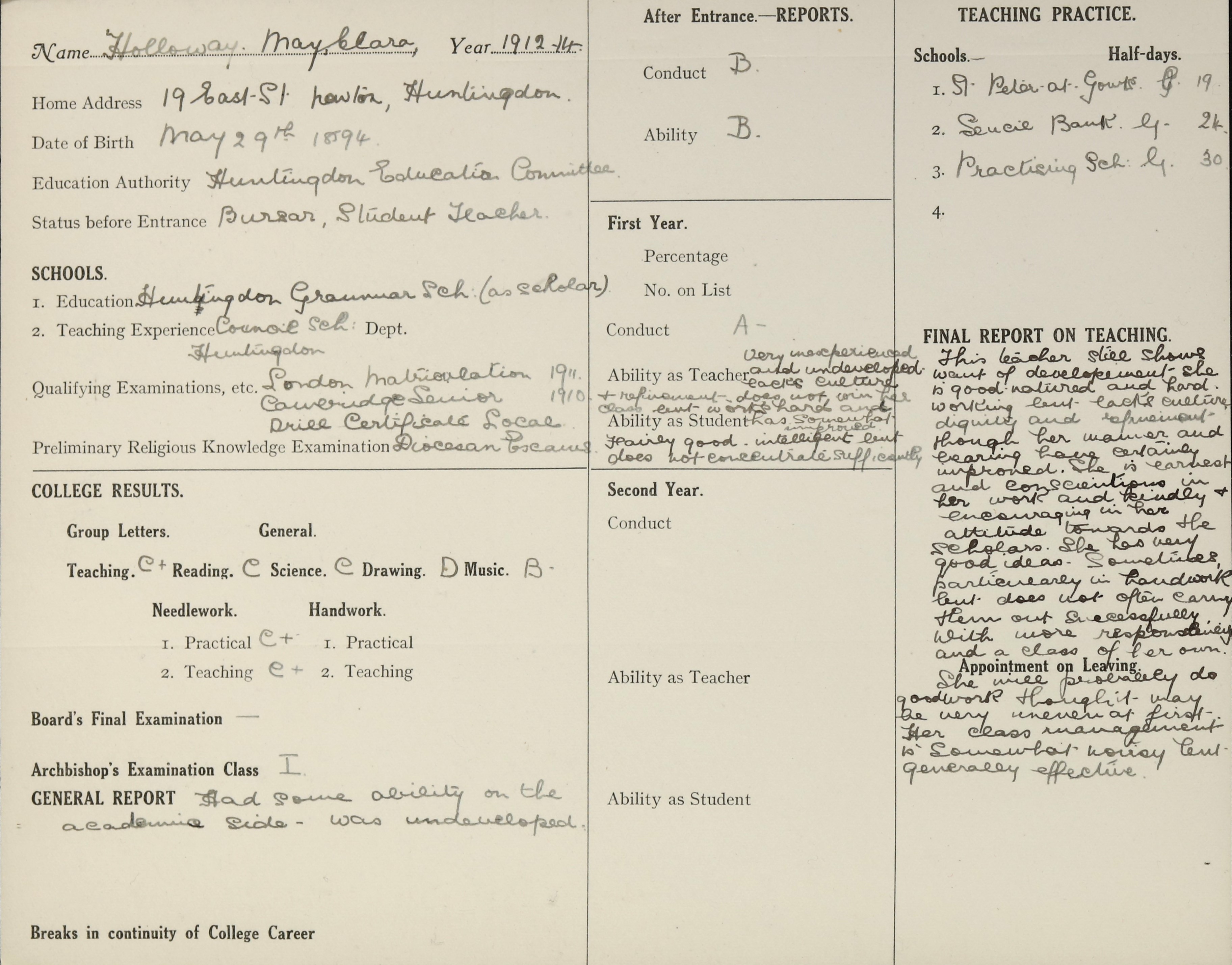 Camb. Senior Local 1910, Matric (London) 1911.