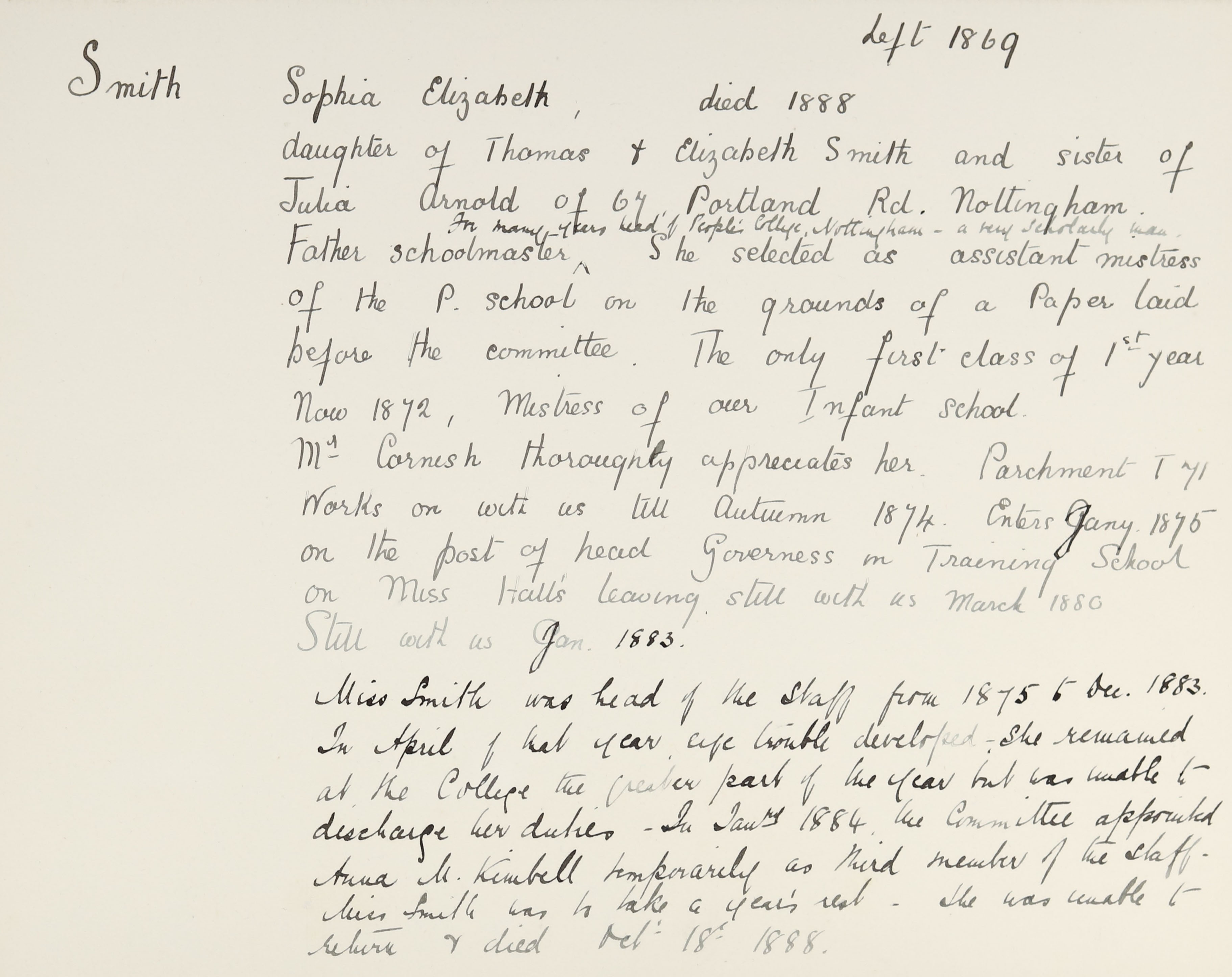 Sister: Julia Arnold Smith (b. 1846) [LDTC 1867}, Amelia Buckley Smith (b. 1850)[LDTC 1871], Clara A Smith (b. 1854) and Louisa Smith (b. 1856).