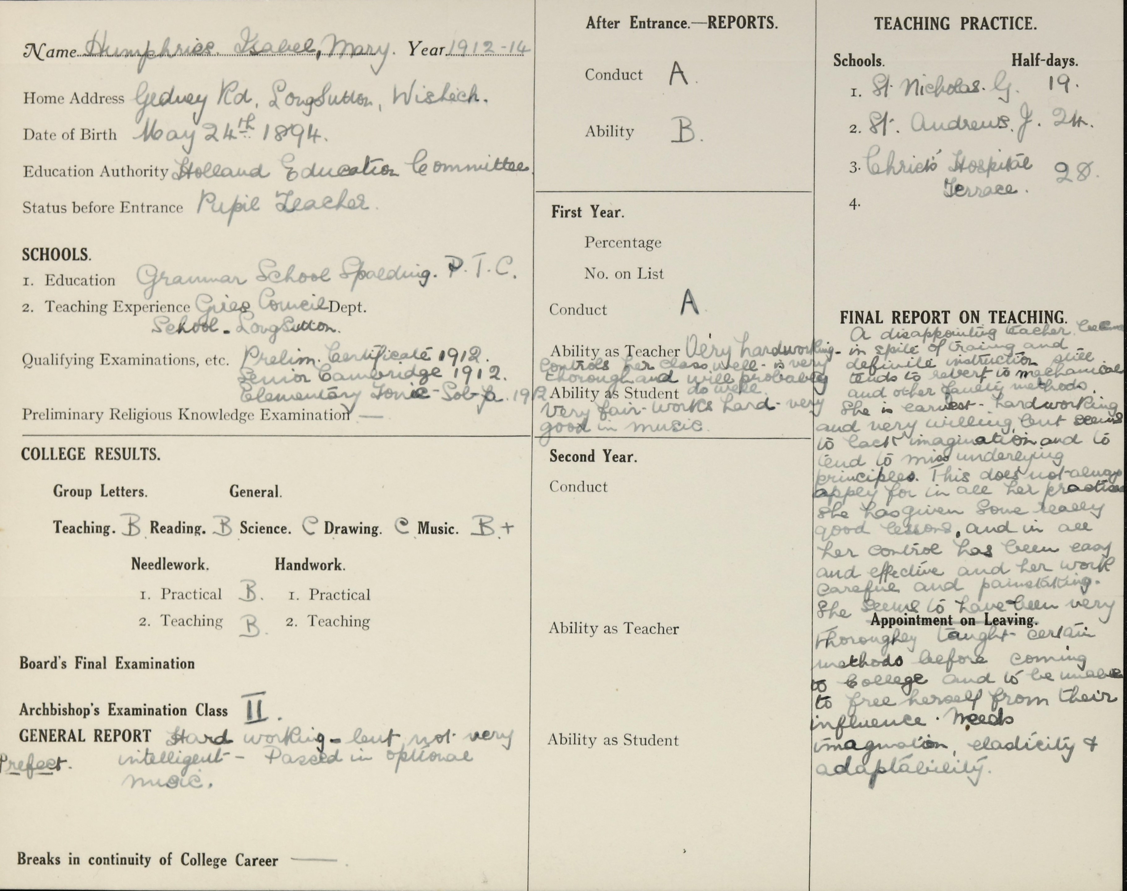 She is at Chapel Bridge, Long Sutton. Her father is listed as ‘Law Clerk’. Isabel is listed as ‘School Part-Time Pupil Teacher’. Her mother and siblings (Evelyn and Leonard) are unlisted.