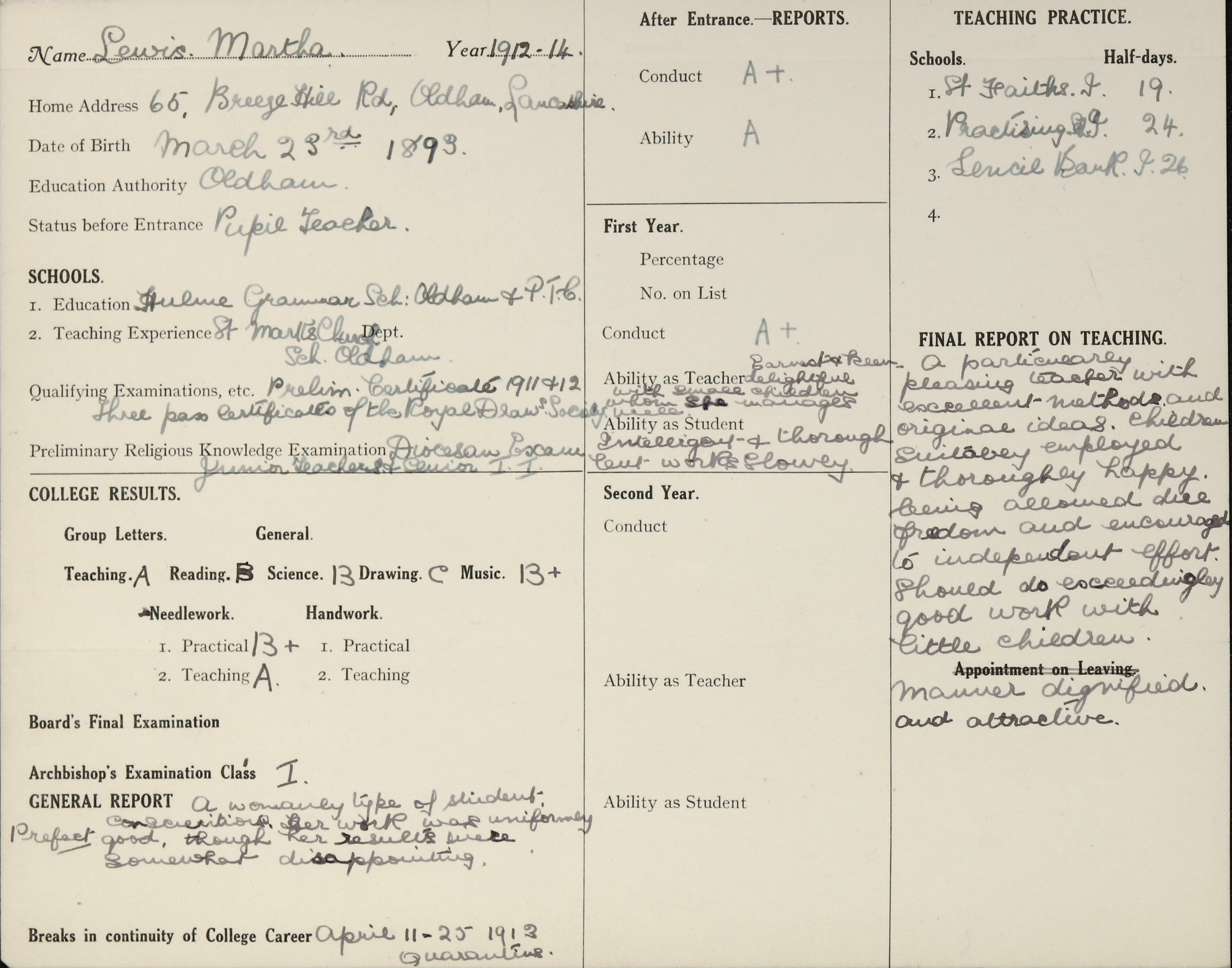 She is at 61 Breeze Hill Road, Oldham. Her father is listed as ‘Fire Engineer and Commercial Traveller’. Martha, her mother and siblings (Thomas, Edward and Annie) are unlisted.