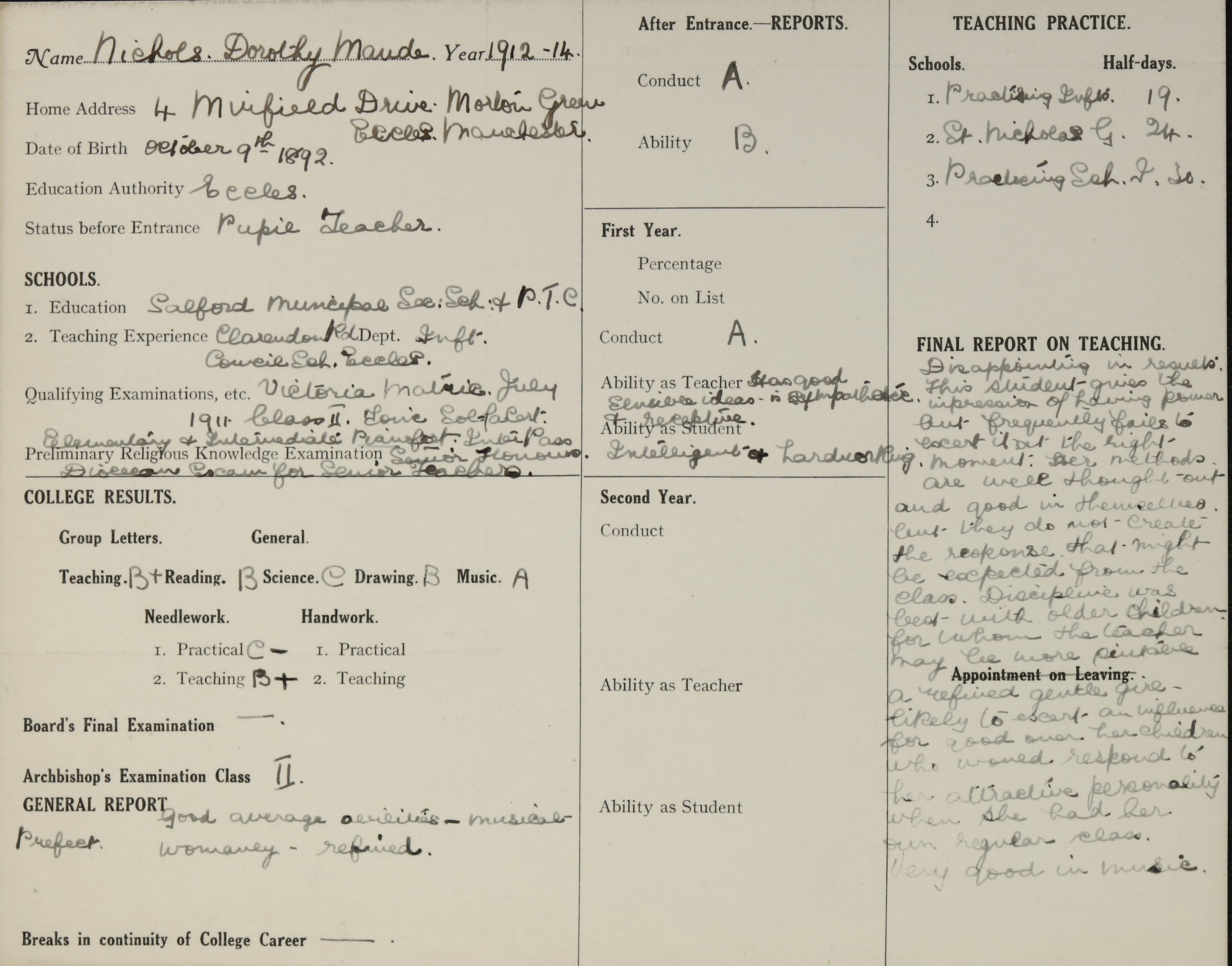She is at 4 Mirfield Drive, Monton. Her father is listed as ‘Buyer Home Trade Fancy Drapery’. Her mother is unlisted. Dorothy is listed as ‘Elementary School Teacher’.