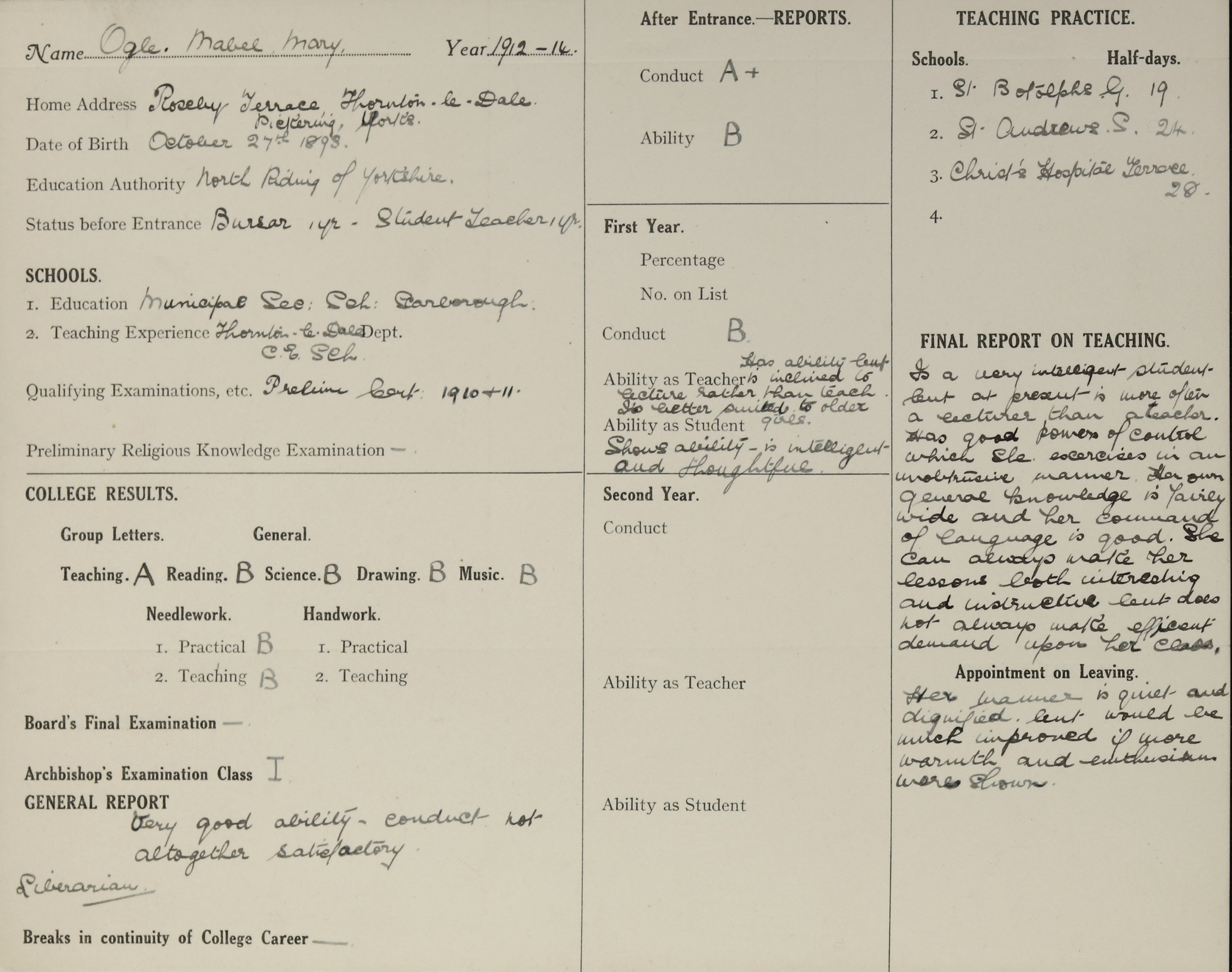She is at Hutton Buscel, West Ayton, Yorkshire. Her father is listed as ‘Boot Maker Master’. Her mother is listed as ‘Dressmaker’. Her brother, Herbert, is listed as ‘Boot Maker Assistant’. Mabel is listed as ‘Student Teacher’.