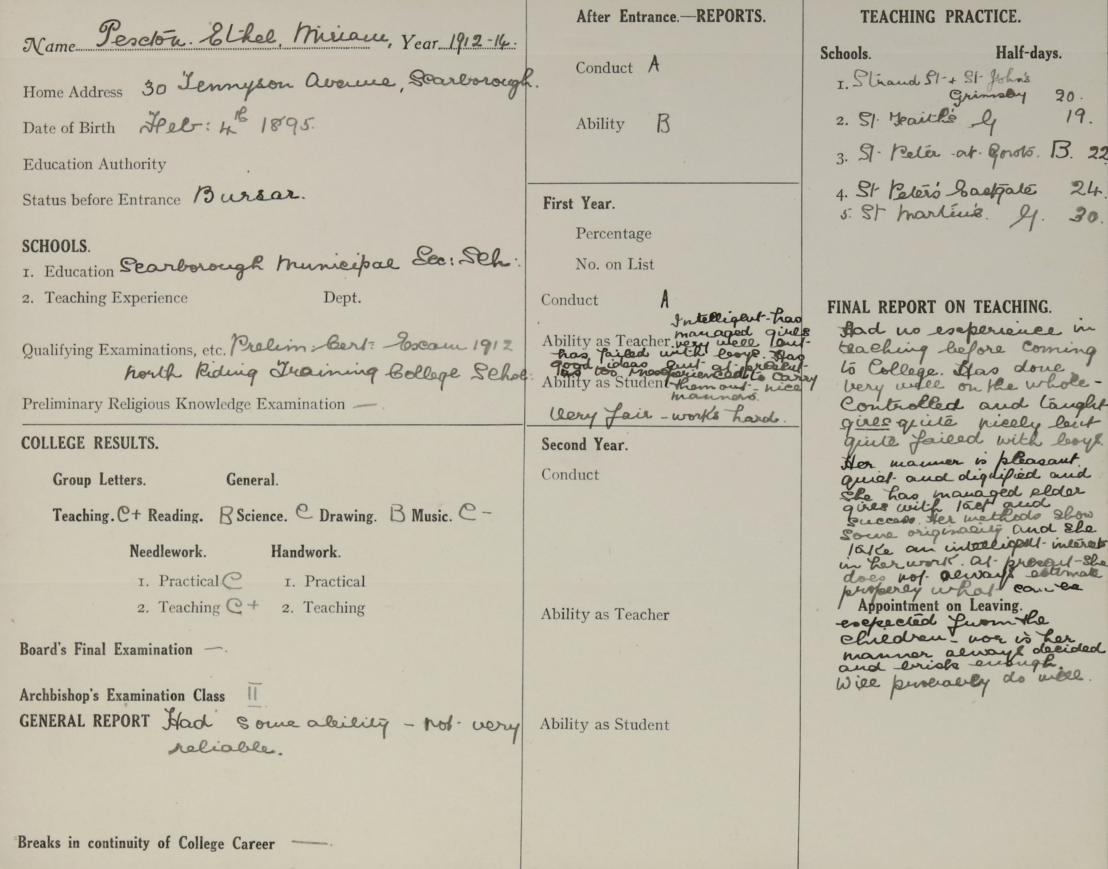 She is at 30 Tennyson Avenue, Scarborough. Her father is listed as ‘Head Teacher’. Ethel, her mother and her brother, Frederick, are unlisted.