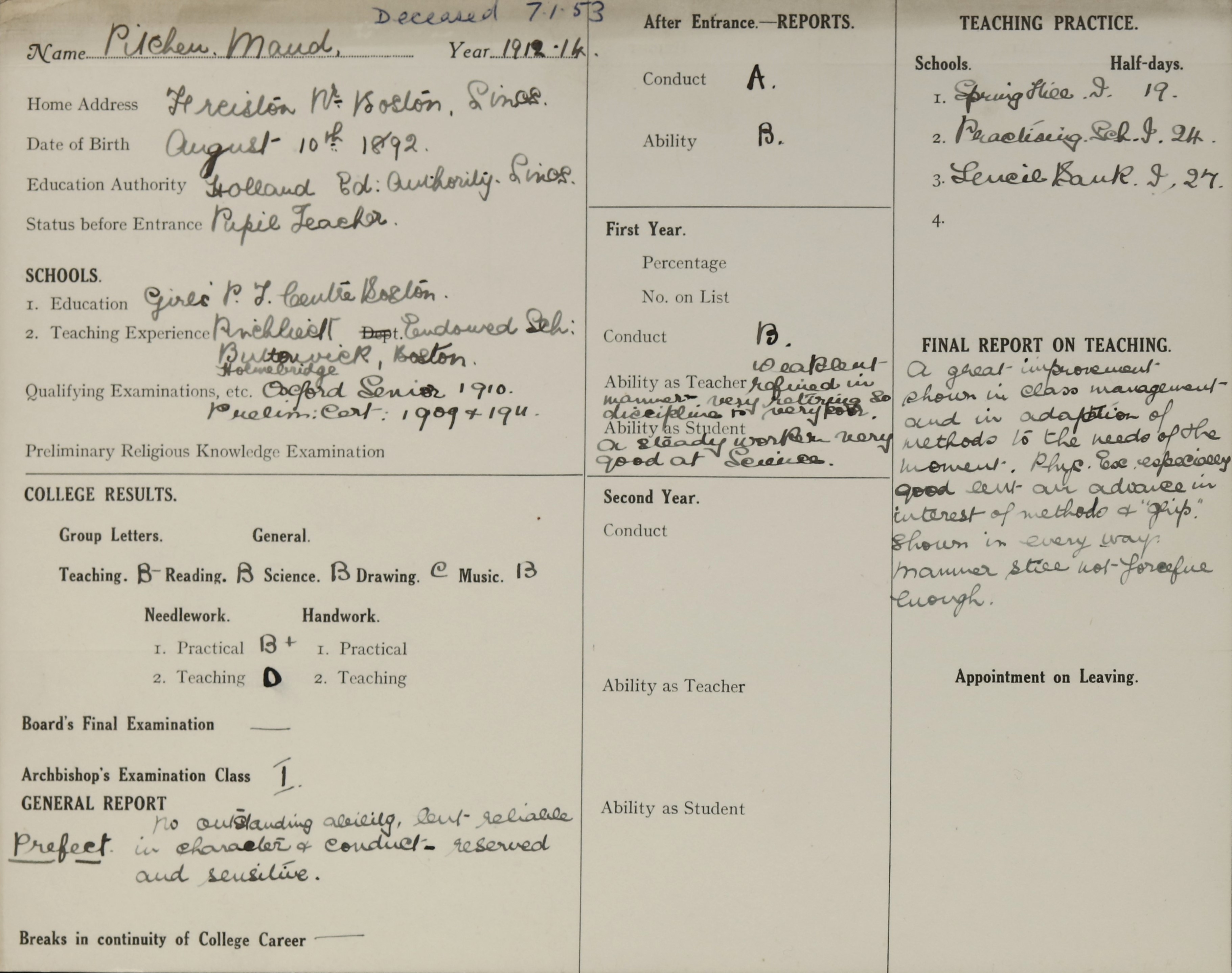 She is at Homers Lane, Freiston. Her father is listed as ‘Highway Surveyor Rural District Council’. Her sister, Kate, is listed as ‘Teacher’. Her brother, Frank, is listed as ‘Farmer’. Maus is listed as ‘Student Part-Time’. Her mother and sister, Ethel, are unlisted. Her grandfather, Edward East (b. 1833), is listed as ‘Retired Wool Merchant’.