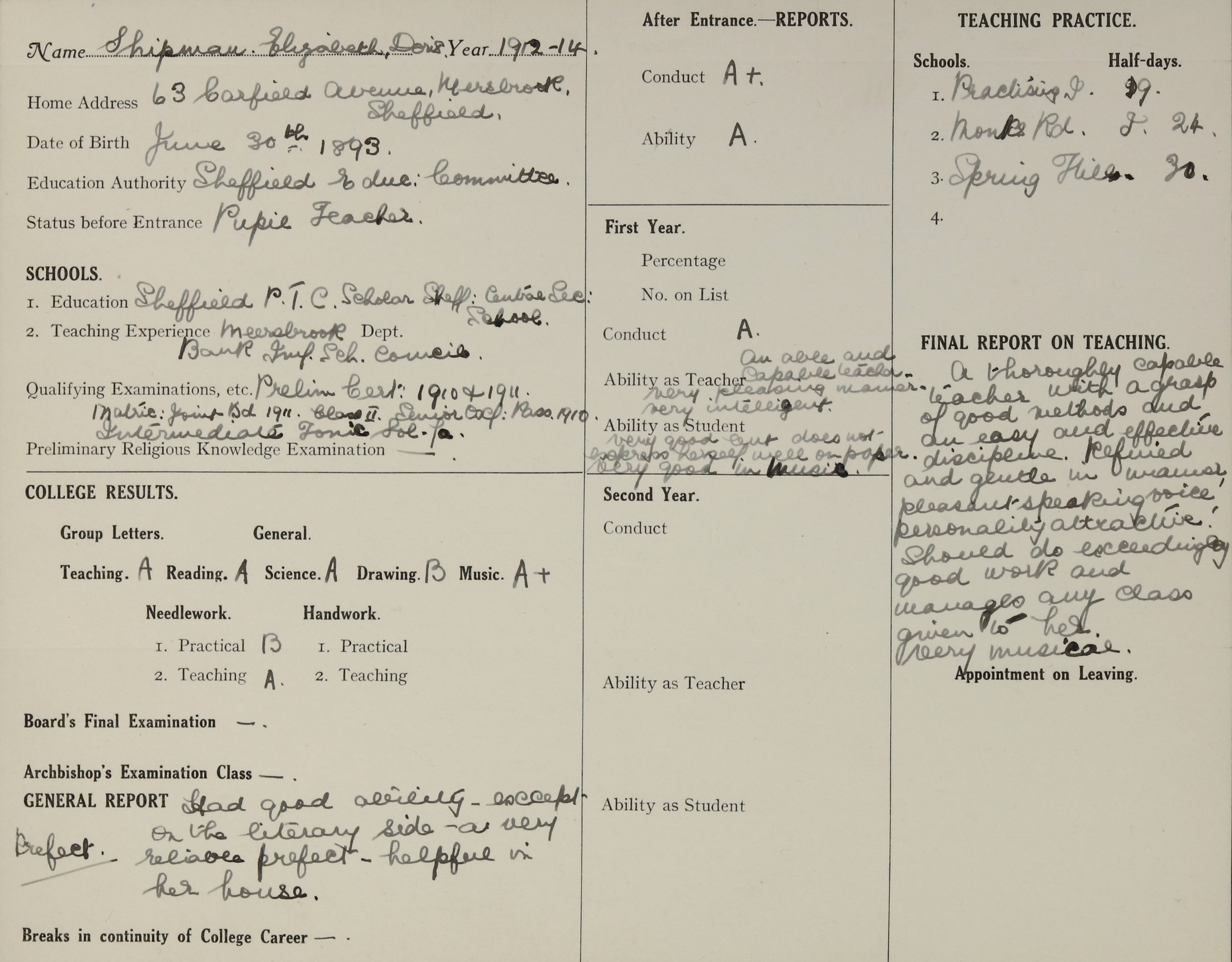 She is at 63 Hemsworth Road, Sheffield. Her father is listed as ‘Traveller Retired’. Her mother is unlisted. Elizabeth is listed as ‘Primary Council School Teacher’.