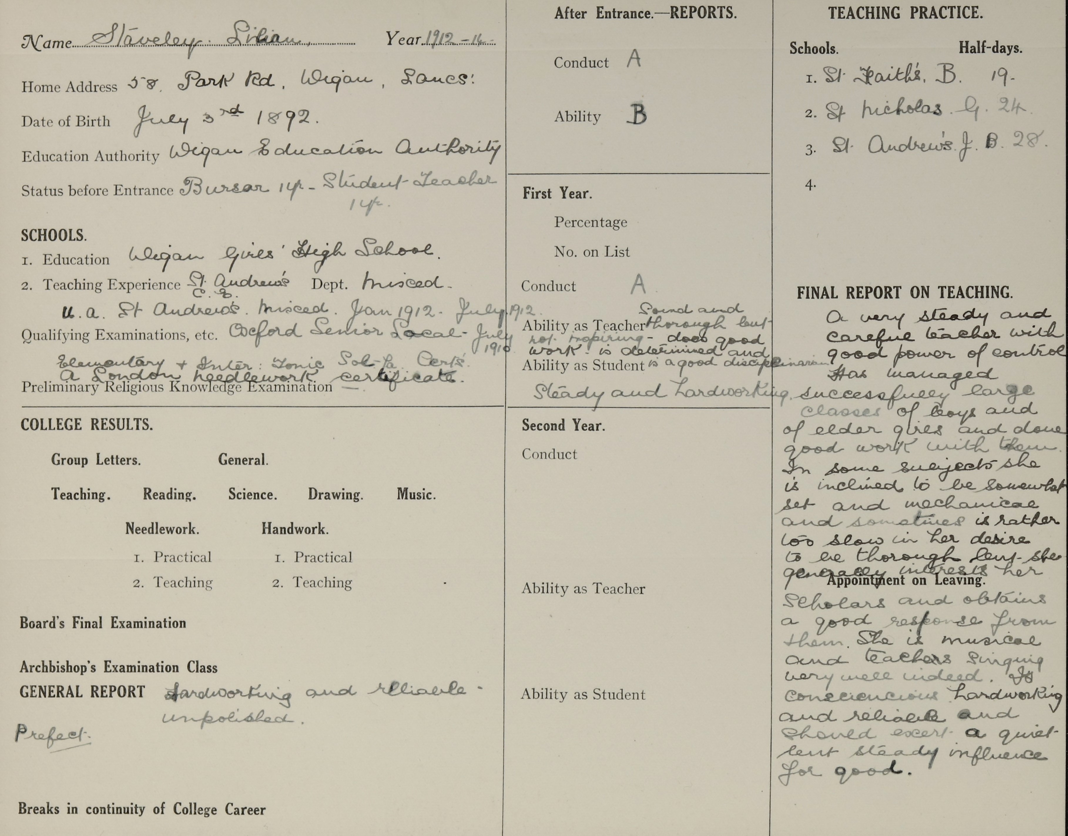 She is at 15 Park Road, Wigan. Her father and brother, Harold, is listed as ‘Engineer Patternmaker’. Her mother is unlisted. Her sister, Alice, is listed as ‘School Teacher’. Her sister, Emily, is listed as ‘Cookbinder Assistant’. Her brother, John, is listed as ‘Engineer Fitter’. Her sister, Clara, is listed as ‘Dressmaker’. Her brother, Walter, is listed as ‘Cabinet Maker’. Lilian is listed as ‘Student Teacher’. Her sister, Ethel, is listed as ‘Typist’.