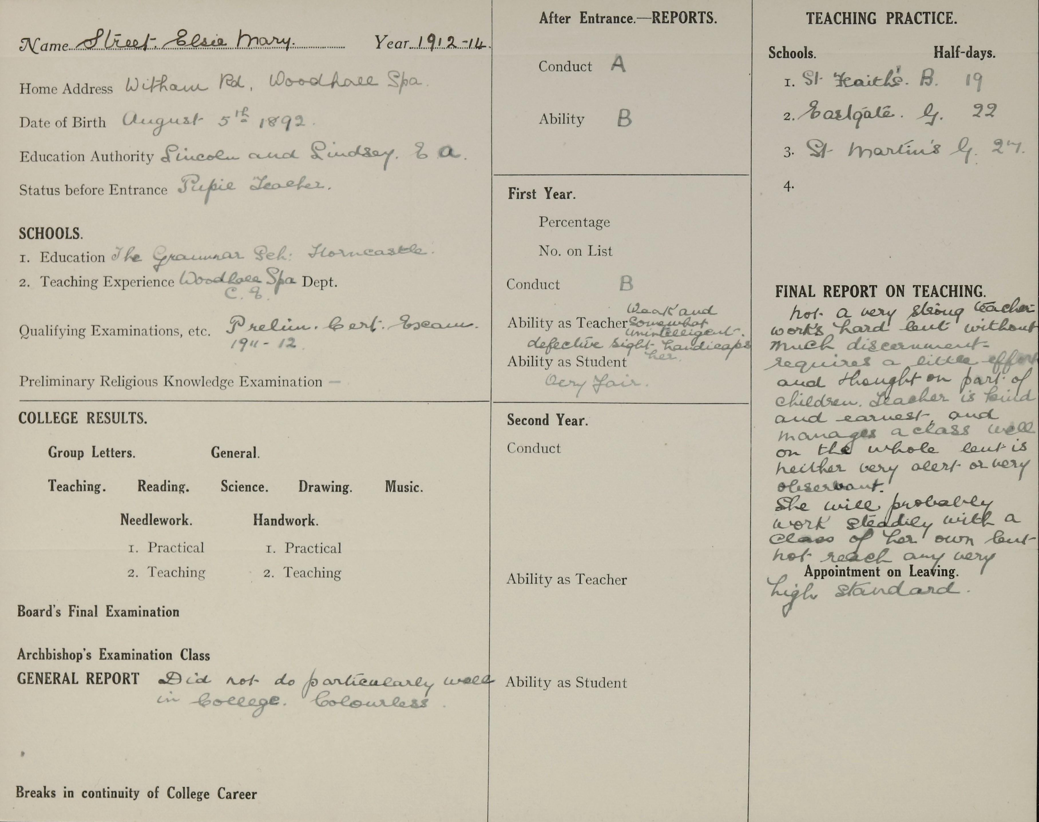 She is at Witham Road, Woodall Spa, Lincoln. Her father and brother, Hewson, are listed as ‘Shoeing and General Smith’. Elsie is listed as ‘School Teacher’. Her mother, her siblings (Sydney, Gwendoline and Brenda) and her grandmother, Ann Ling Thorpe (b. 1835) are unlisted.