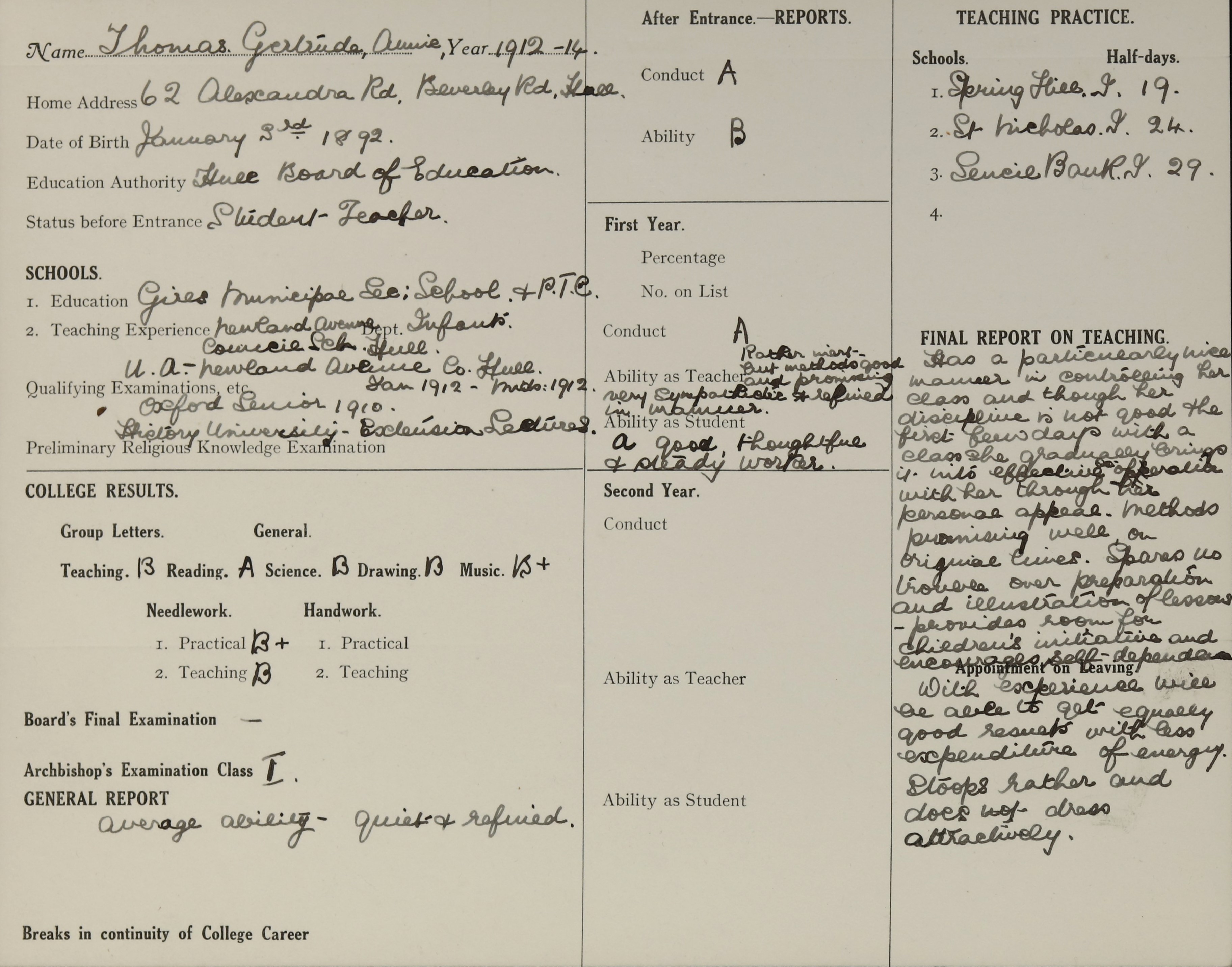 She is at 62 Alexandra Road, Beverley, Hull. Her father is listed as ‘Assistant Superintendent 2nd Class Department of Civil Service’. Her sister, Jessie, is listed as ‘Telephonist Post Office Hull’. Gertrude is listed as ‘Student Teacher Hull Board of Education’. Her mother and siblings (Edith, Marjorie, Ibbie, Alfred, Amy and Ida) are unlisted.