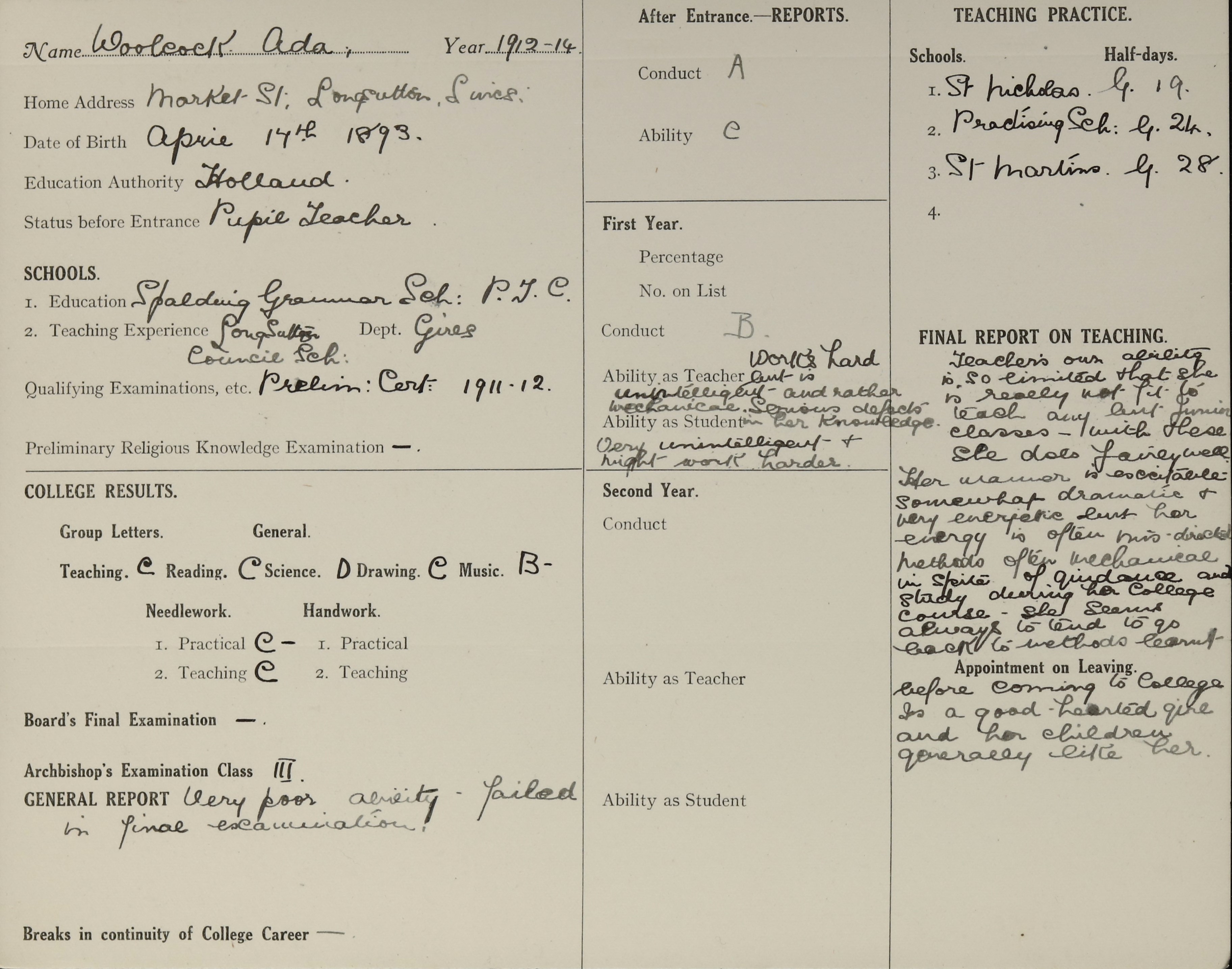 She is at Fox Cottage, Gedney Road, Long Sutton. Her father is listed as ‘Solicitor’s Clerk’. Ada is listed as ‘Pupil Teacher Council School’. Her mother and siblings (Nellie, Alice, Albert and Jessie) are unlisted.