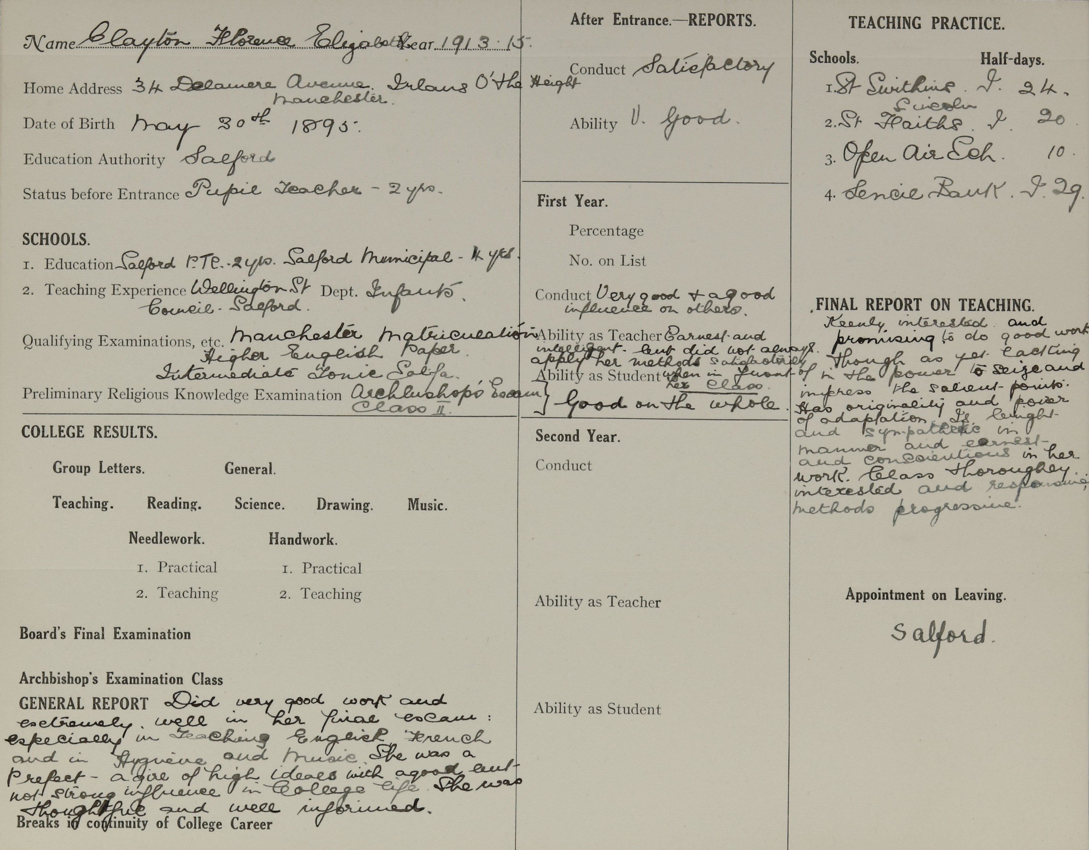She is at 34 Delamere Avenue, Pendleton. Florence and her father are listed as ‘Elementary School Teacher’. Her mother and sister, Ethel, are unlisted.