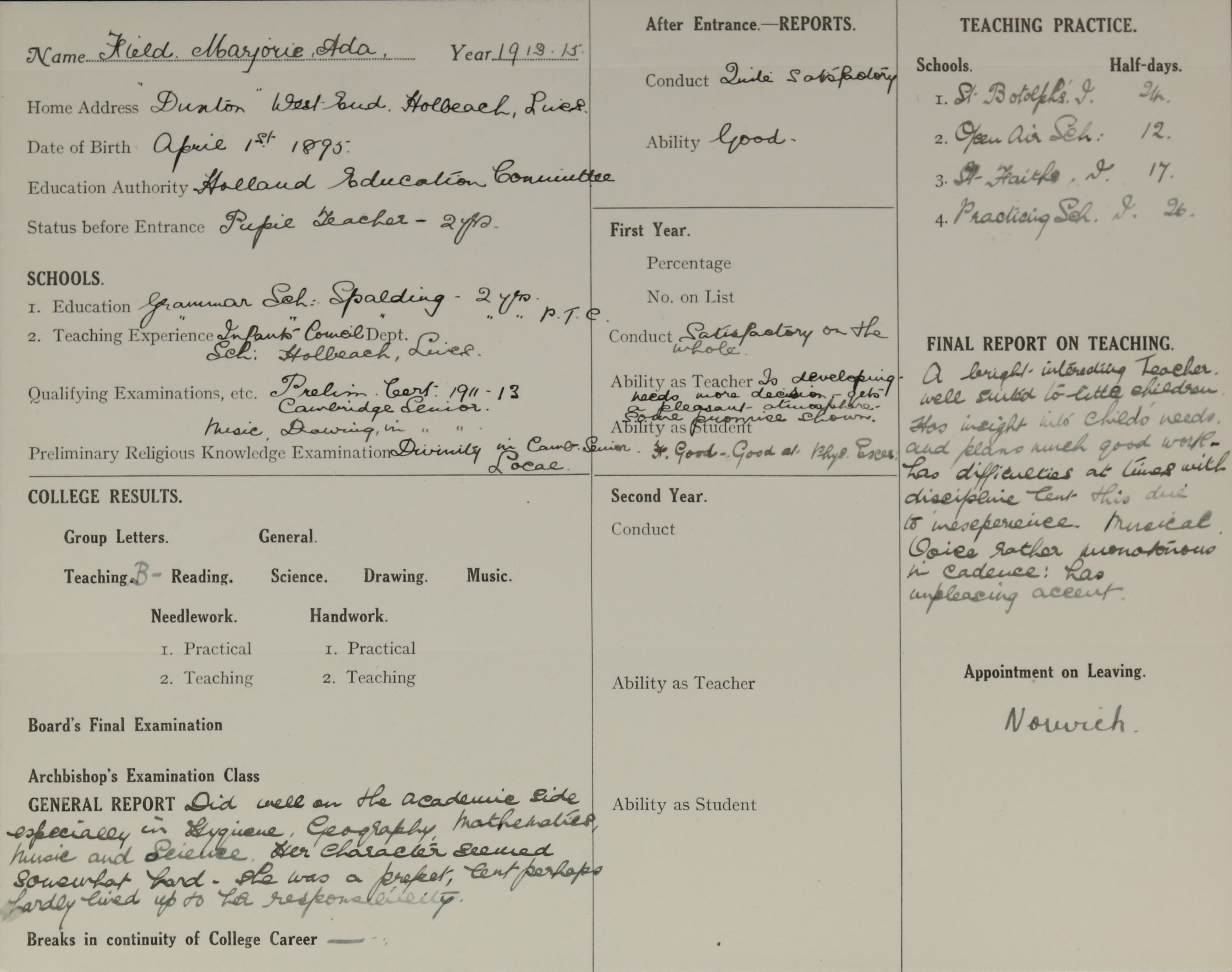 Qualification: Prelim. Cert. Exam. 1913 & Camb. Sen. 1913.