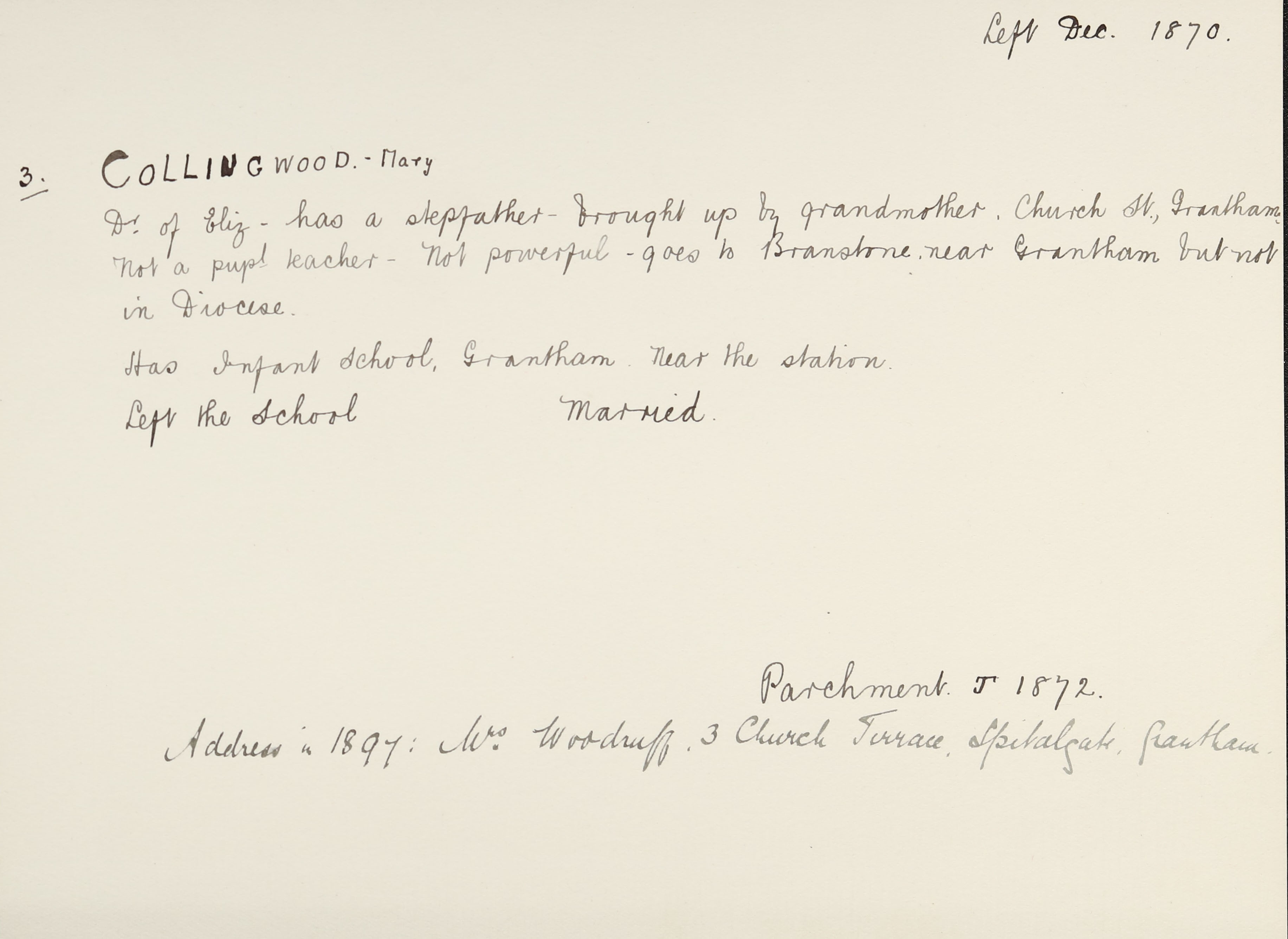Address is 3 Church Terrace, Spitalgate, Grantham.
