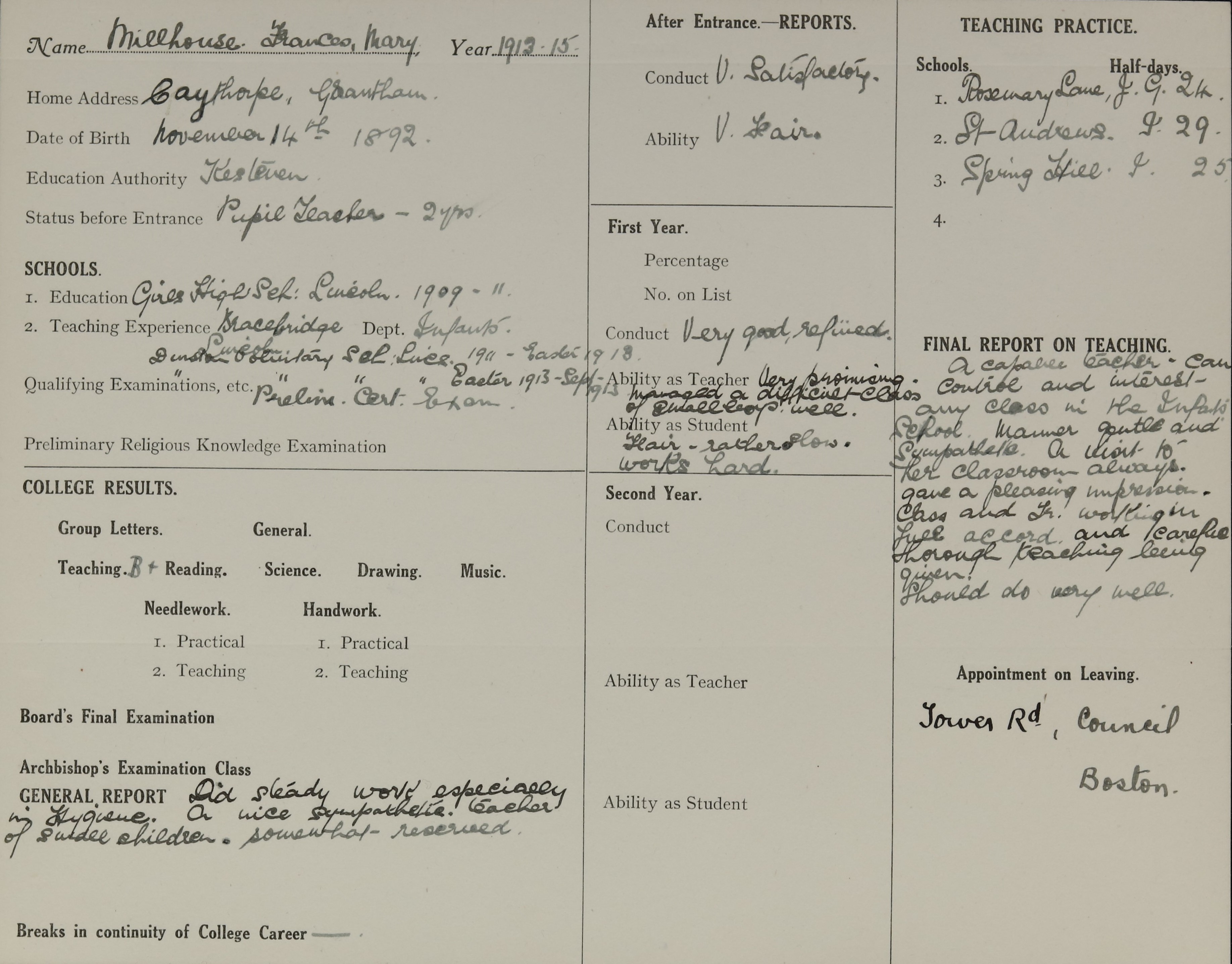 She is at Caythorpe, Grantham. Her father is listed as ‘Stone Mason’. Her mother is unlisted. Frances is listed as ‘Pupil Teacher’. Her brother, John, is listed as ‘School and News Boy’.