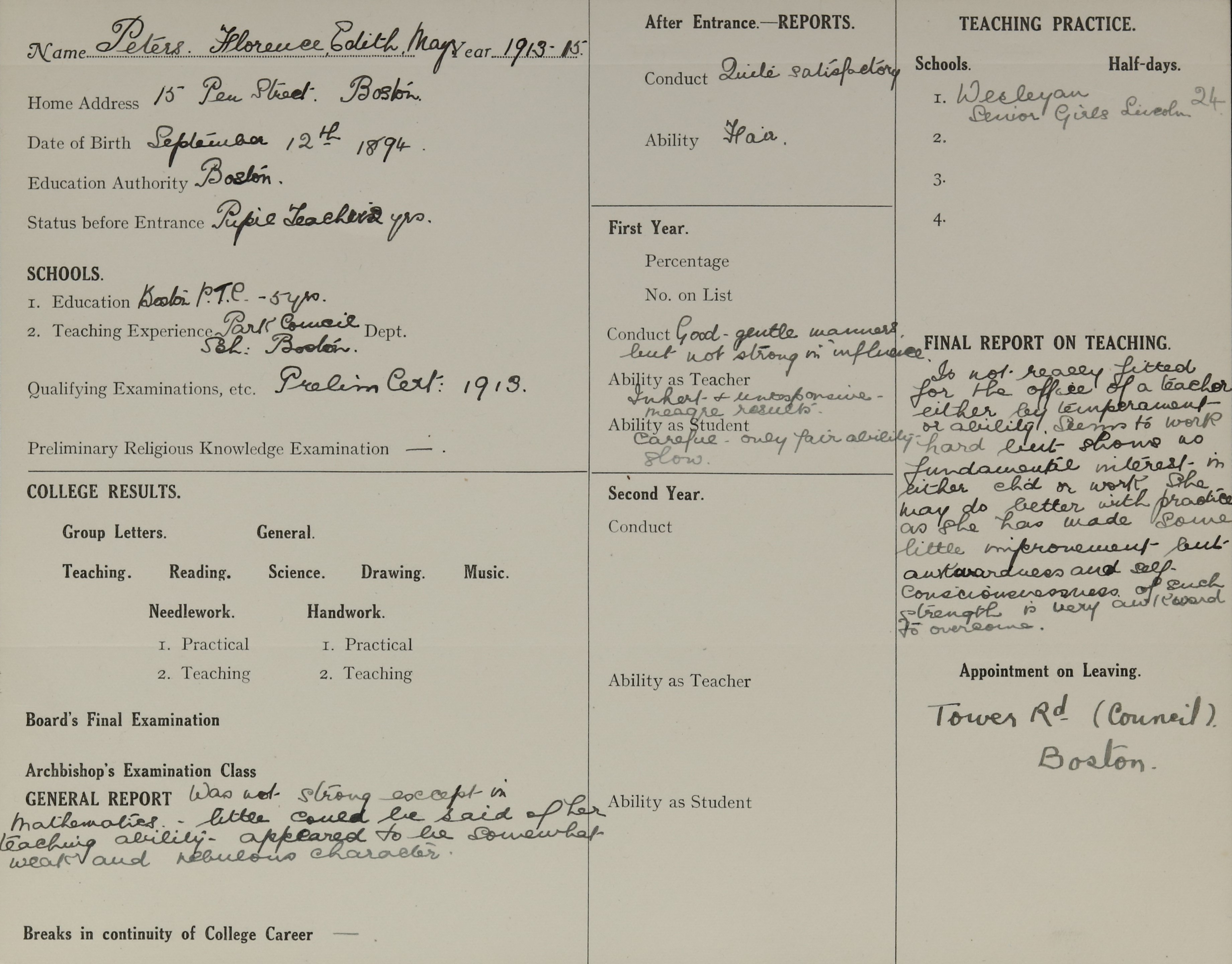 Qualification: Prelim. Cert. Exam 1913.