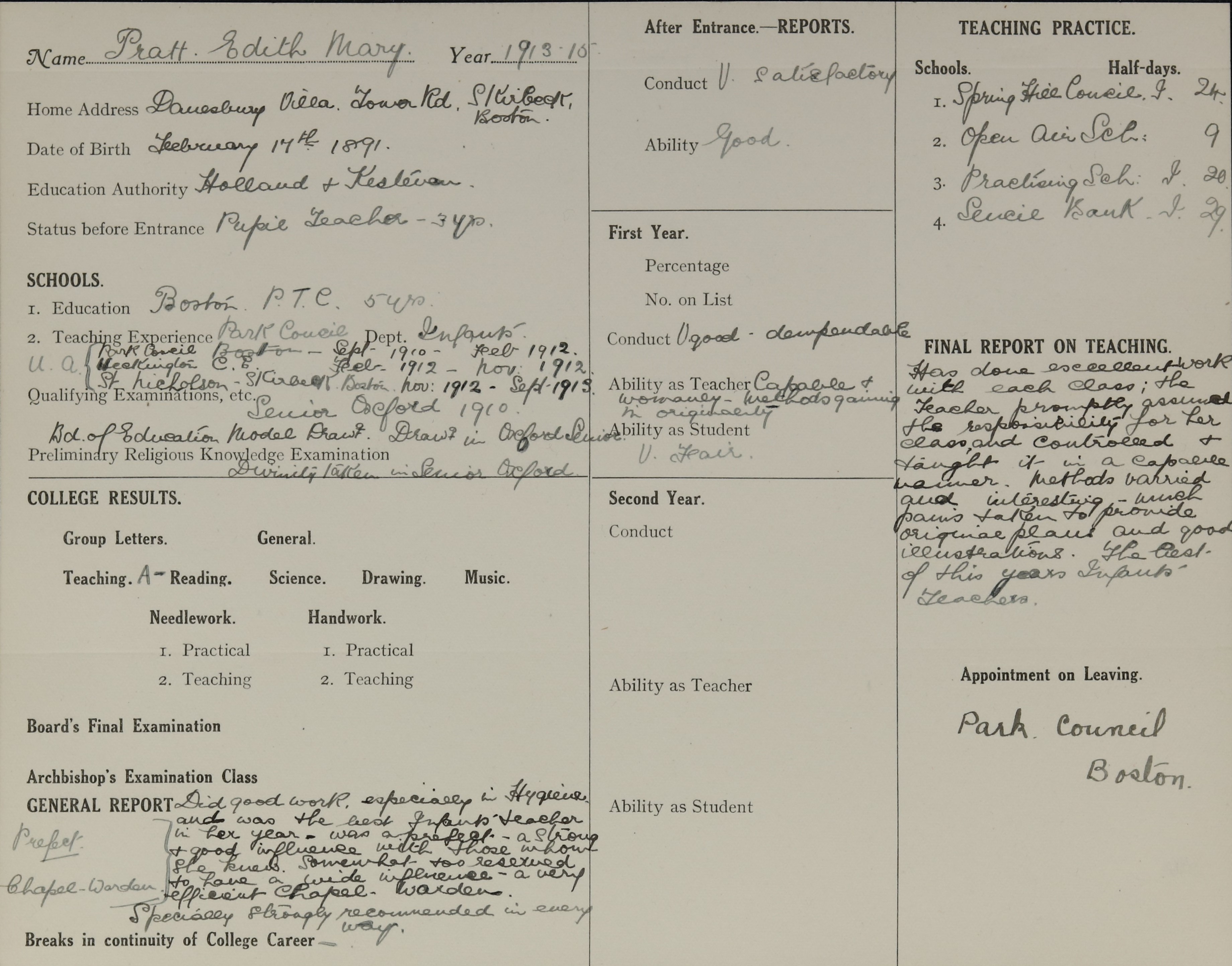 Qualification: Oxford Sen. Local 1909 & 1910.